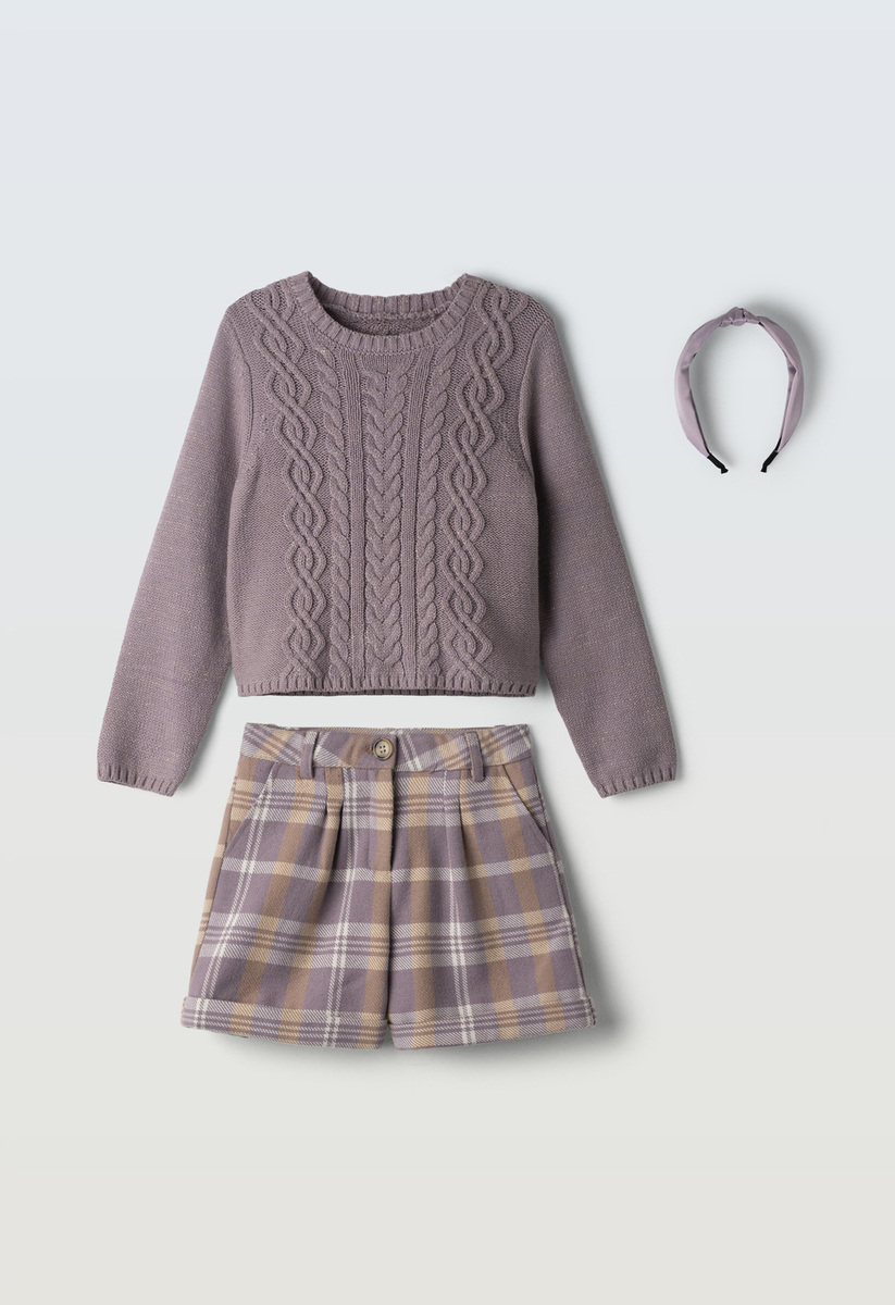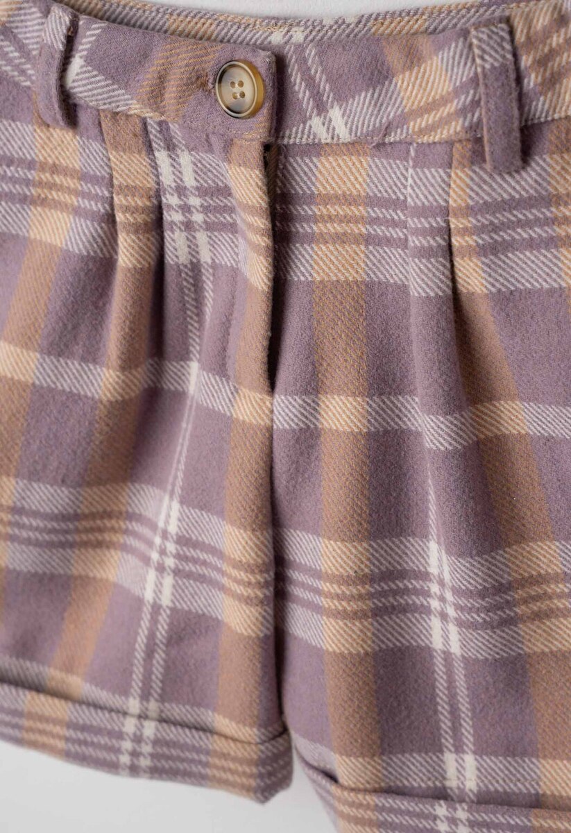 Σετ σορτς ΕΒΙΤΑ σε λιλά χρώμα, μπλούζα πλεκτή με στρογγυλή λαιμόκοψη, σορτς με καρό σχέδιο, κούμπωμα με κουμπί και φερμουάρ.