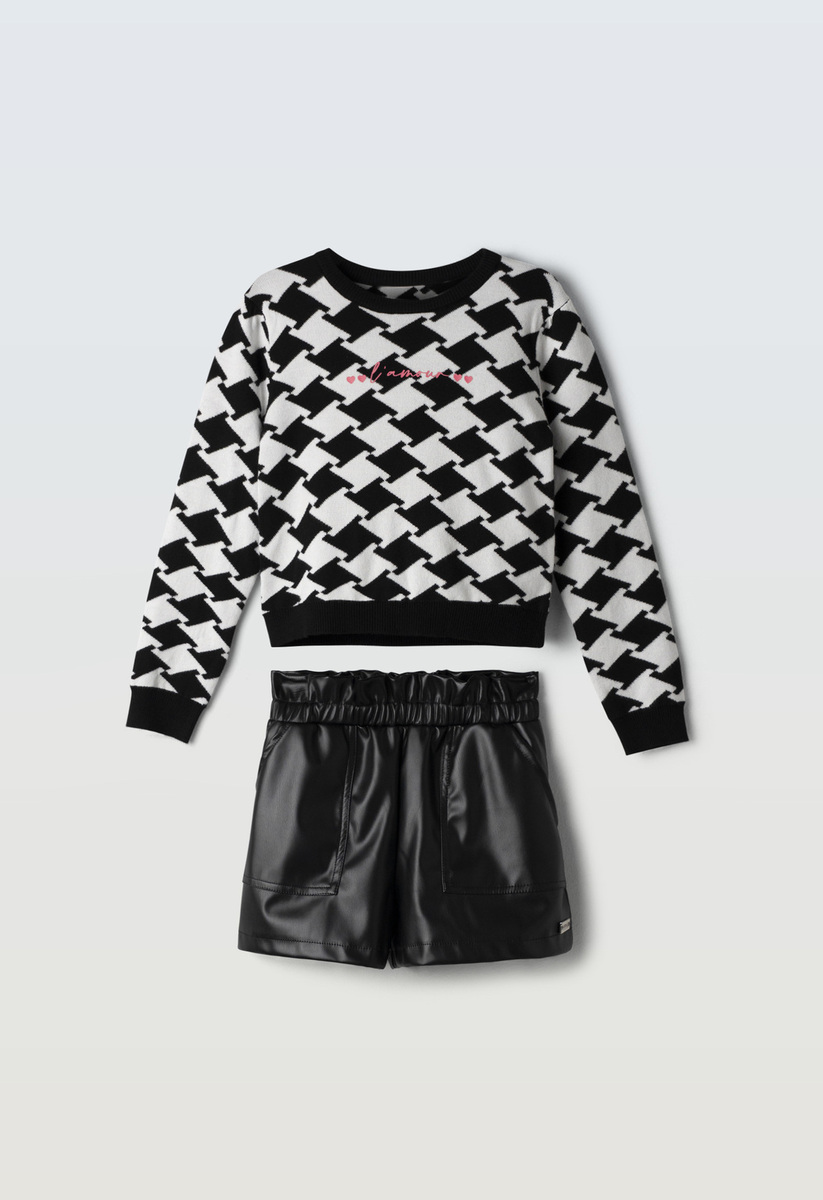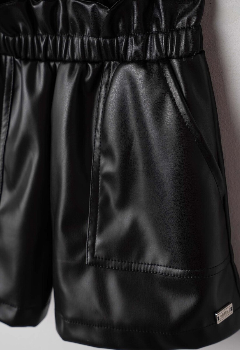 Σετ σορτς ΕΒΙΤΑ, μπλούζα πλεκτή σε χρώμα λευκό-μαύρο με στρογγυλή λαιμόκοψη και σορτς δερμάτινο σε μαύρο χρώμα με λάστιχο στη μέση.