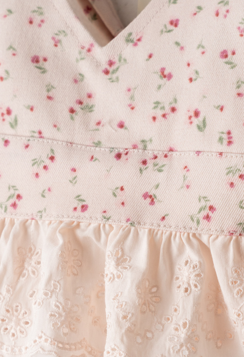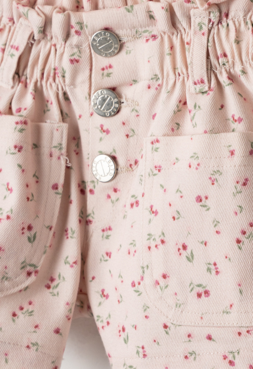Σετ σορτς ΕΒΙΤΑ, μπλούζα με κλείσιμο πίσω στο λαιμό, διακοσμητικό βολάν στο τελείωμα και σορτς με λάστιχο στη μέση σε χρώμα ροζ ανοιχτό. Διαθέτει δύο εξωτερικές τσέπες στο μπροστινό μέρος.
