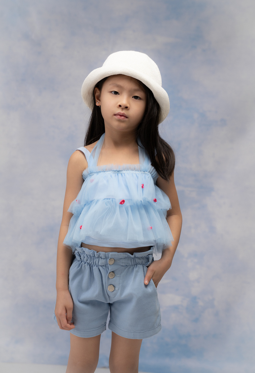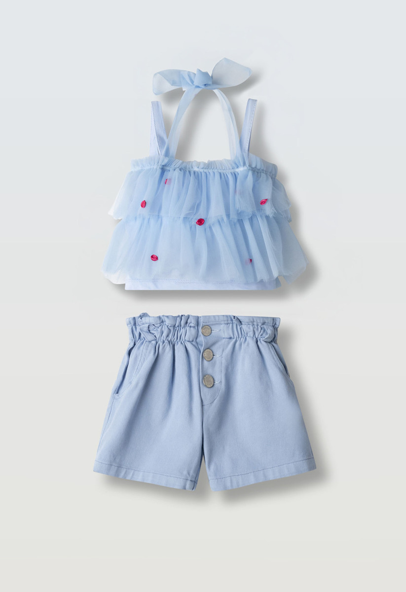 Σετ σορτς ΕΒΙΤΑ, μπλούζα από τούλι με τιράντες, διακοσμητικά τρισδιάστατα τριαντάφυλλα, εσωτερική βαμβακερή επένδυση και σορτς με λάστιχο στη μέση, κλείσιμο με κουμπιά σε χρώμα σιέλ. Διαθέτει δύο εσωτερικές τσέπες στο μπροστινό μέρος.