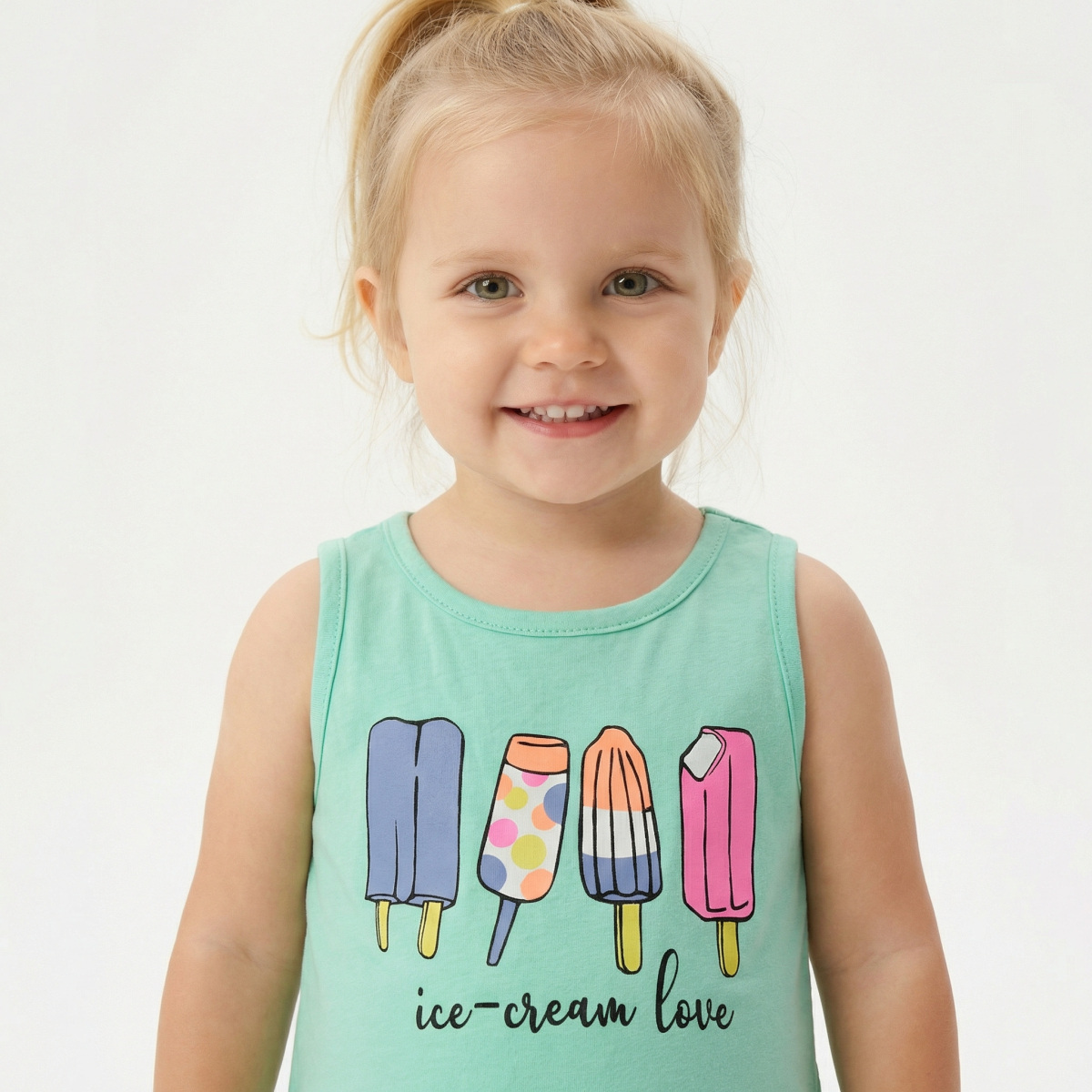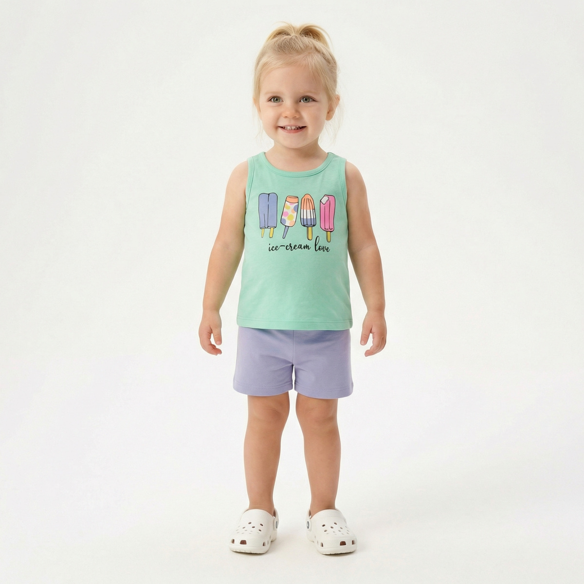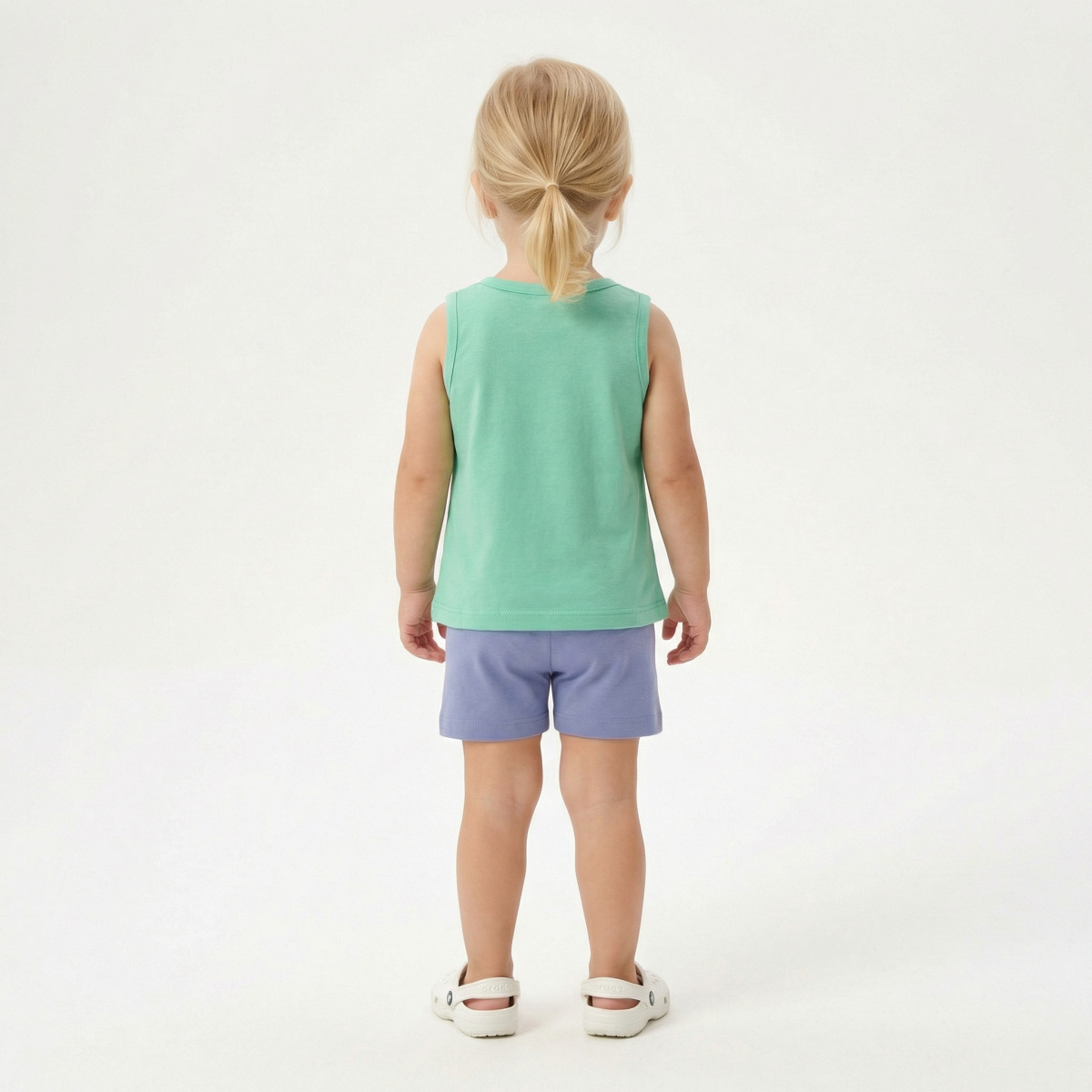 Βαμβακερό σετ TRAX, μπλούζα αμάνικη σε χρώμα τιρκουάζ, τύπωμα στο μπροστινό μέρος, στρογγυλή λαιμόκοψη και σορτς με λάστιχο στη μέση σε χρώμα λιλά.