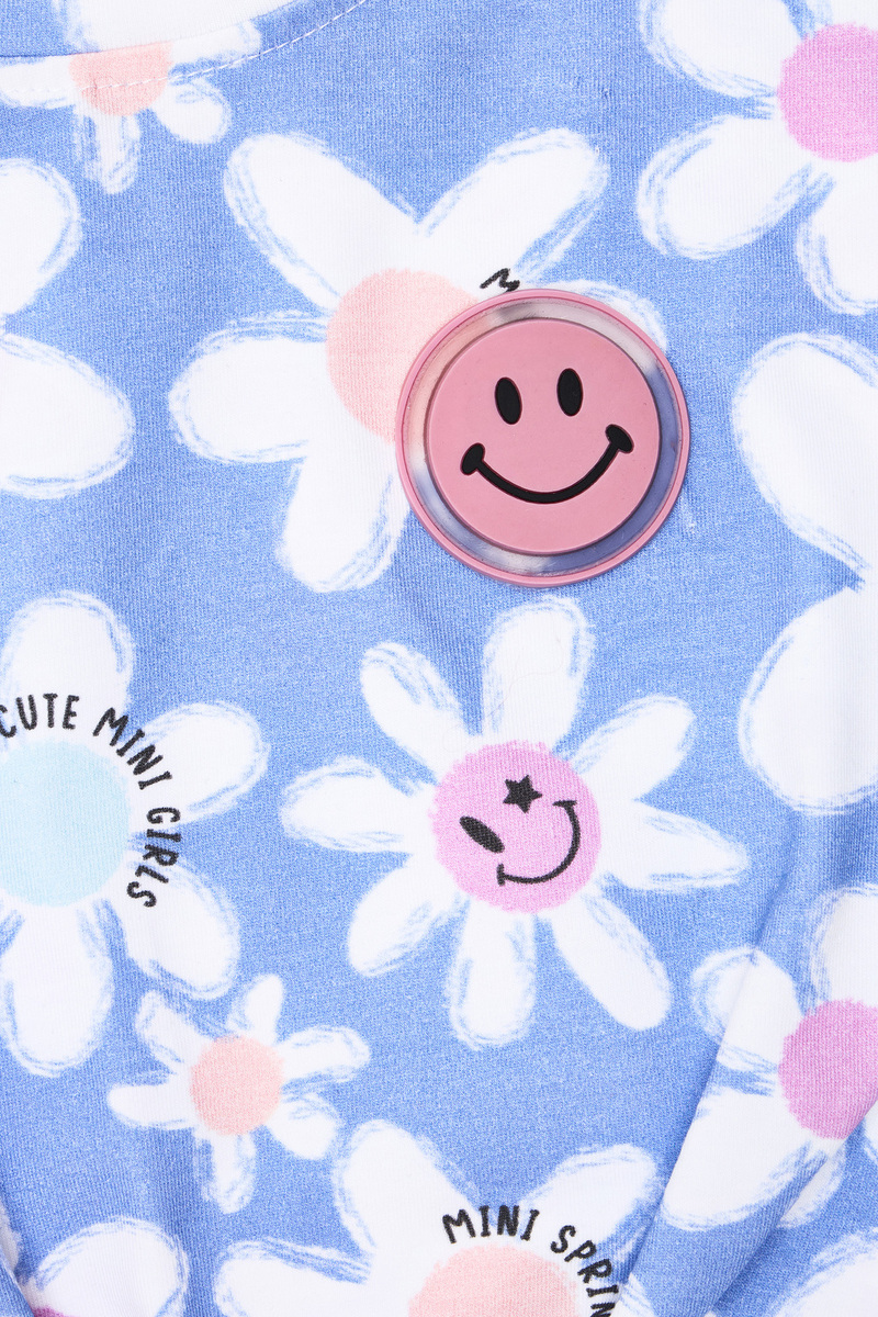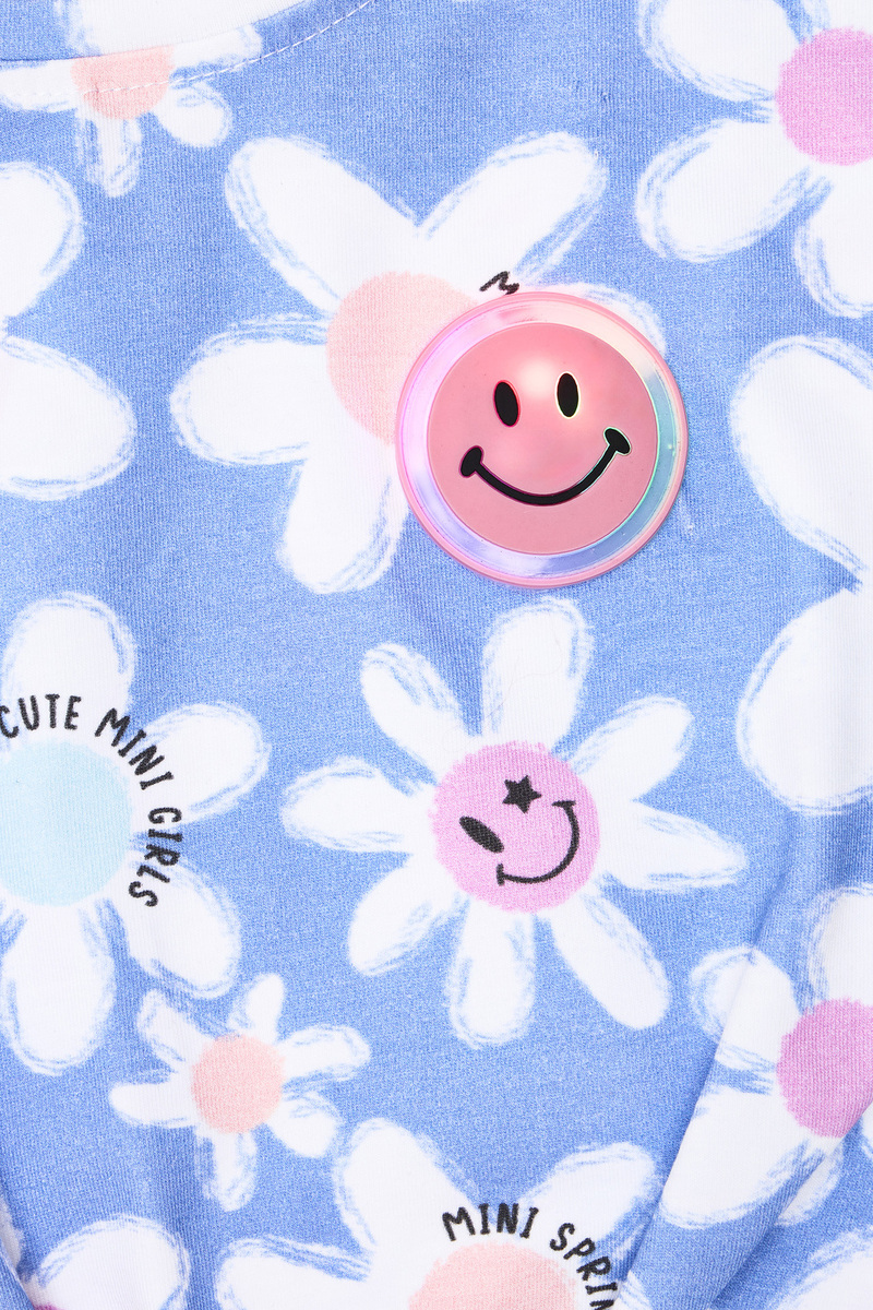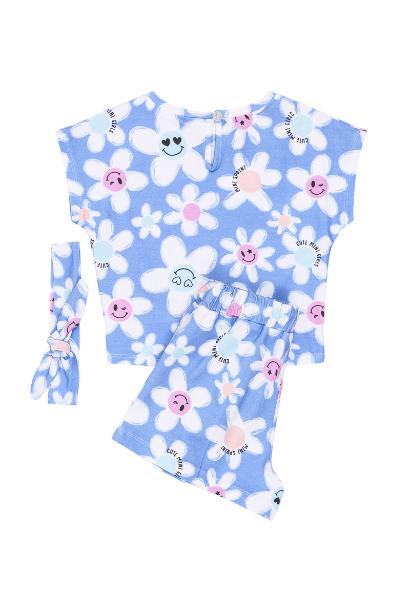 Σετ Sprint, μπλούζα με φωτάκι που ανάβει στην κίνηση, δέσιμο στο κάτω μέρος και σορτς σε χρώμα σιέλ σκούρο με all over τύπωμα μαργαρίτες. Διαθέτει λάστιχο και ρυθμιζόμενο κορδόνι μέσης.