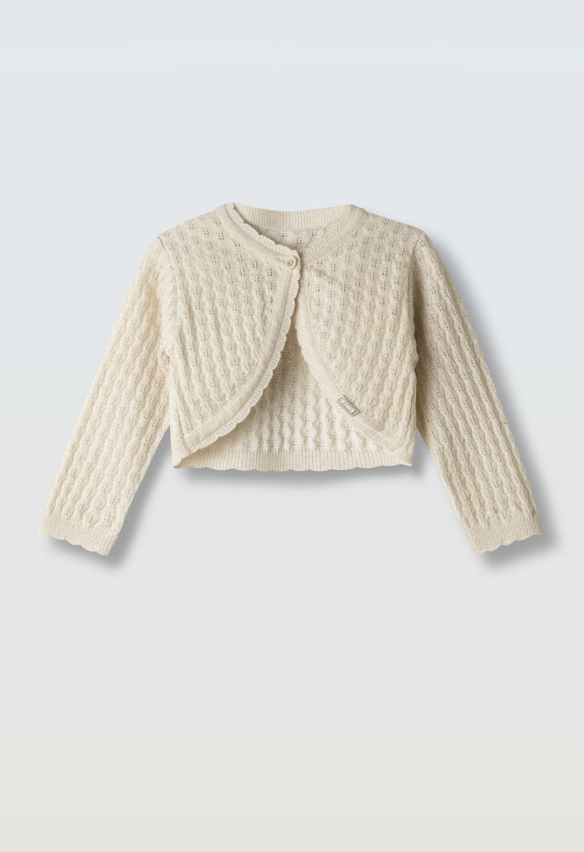 Ζακέτα μπολερό πλεκτή βαμβακερή ΕΒΙΤΑ σε χρώμα μπεζ με στρογγυλή λαιμόκοψη και κλείσιμο με κουμπί .
