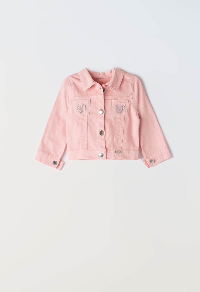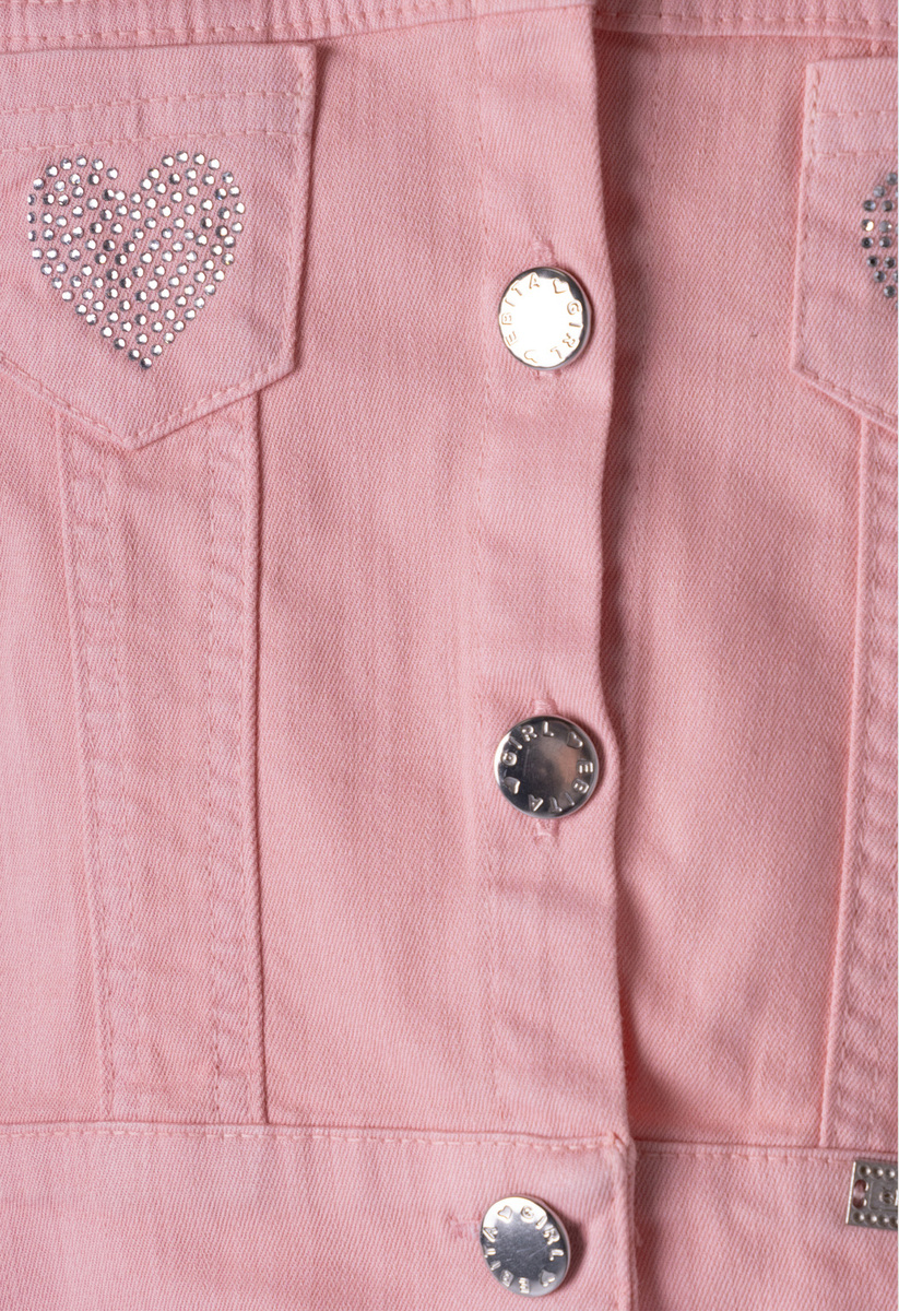 Μπουφάν ΕΒΙΤΑ σε ροζ χρώμα με γιακά, κούμπωμα με κουμπιά στο μπροστινό μέρος και λεπτομέρειες με στρας.