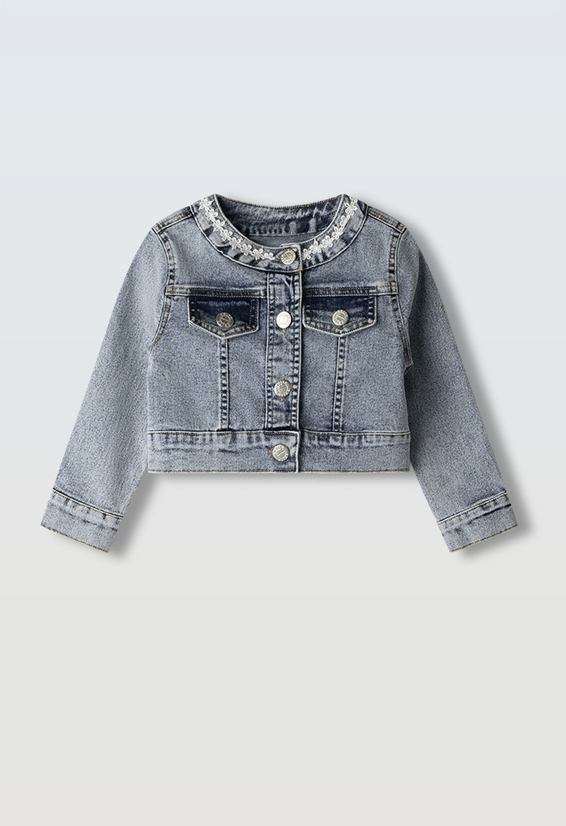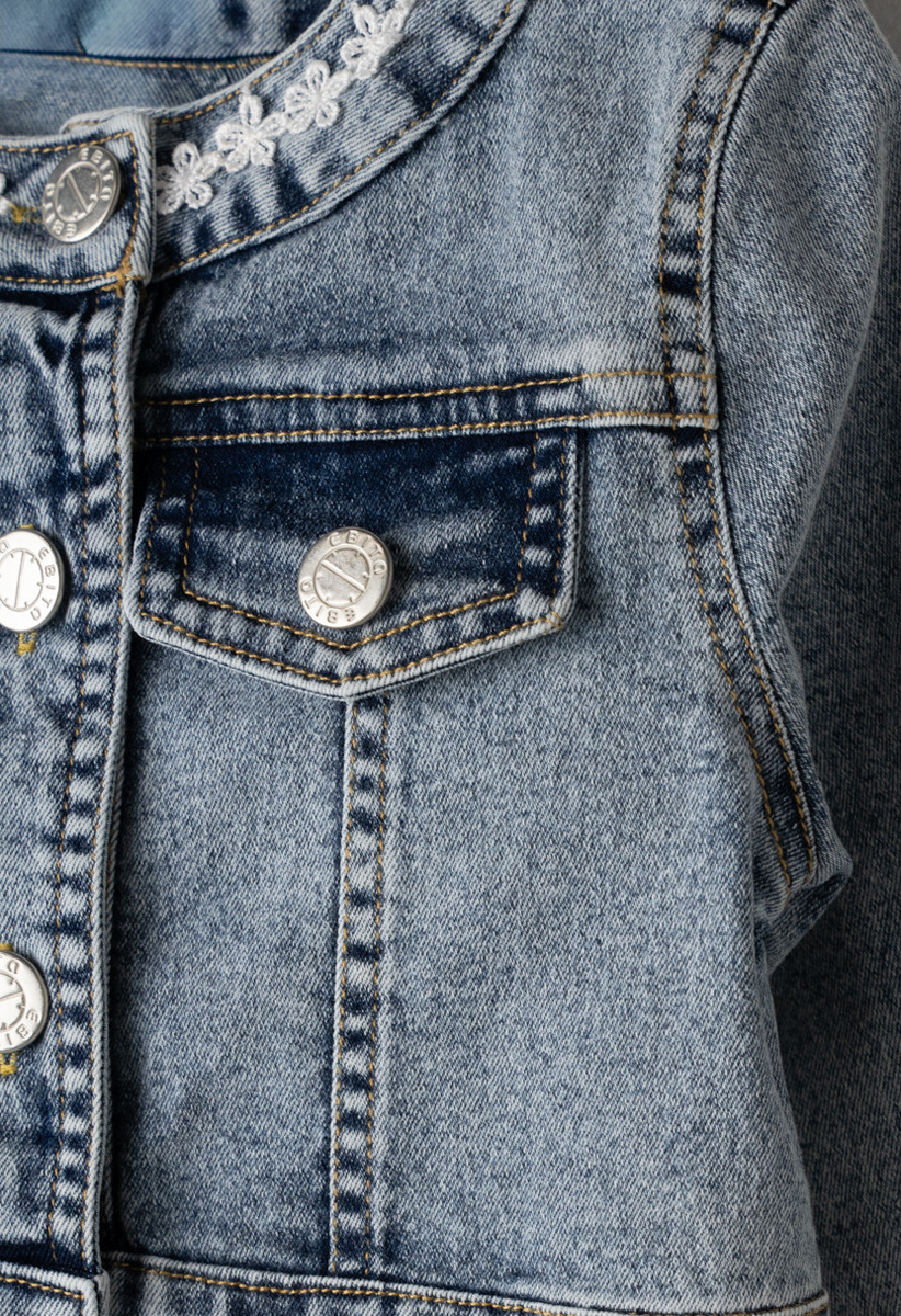 Μπουφάν τζιν ΕΒΙΤΑ σε χρώμα μπλε πετροπλυμένο με γιακά μάο και διακοσμητικά ανάγλυφα λουλούδια.