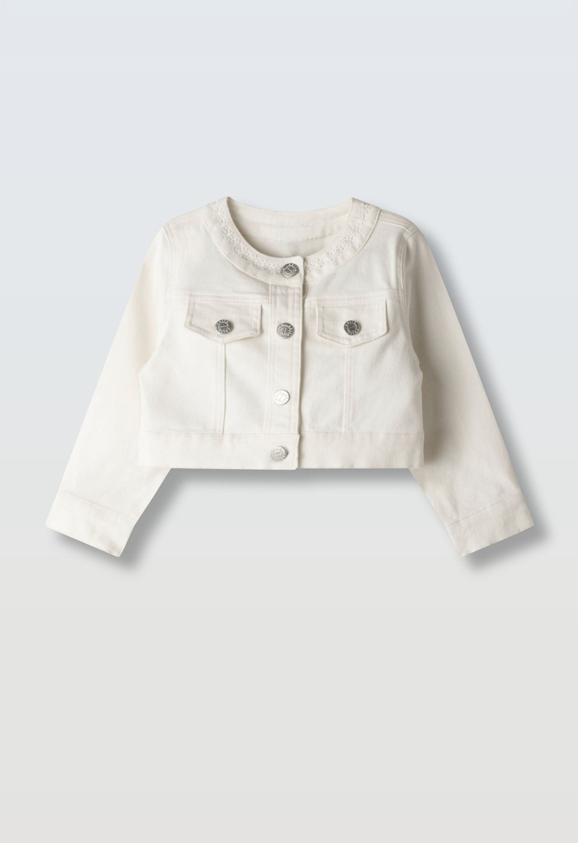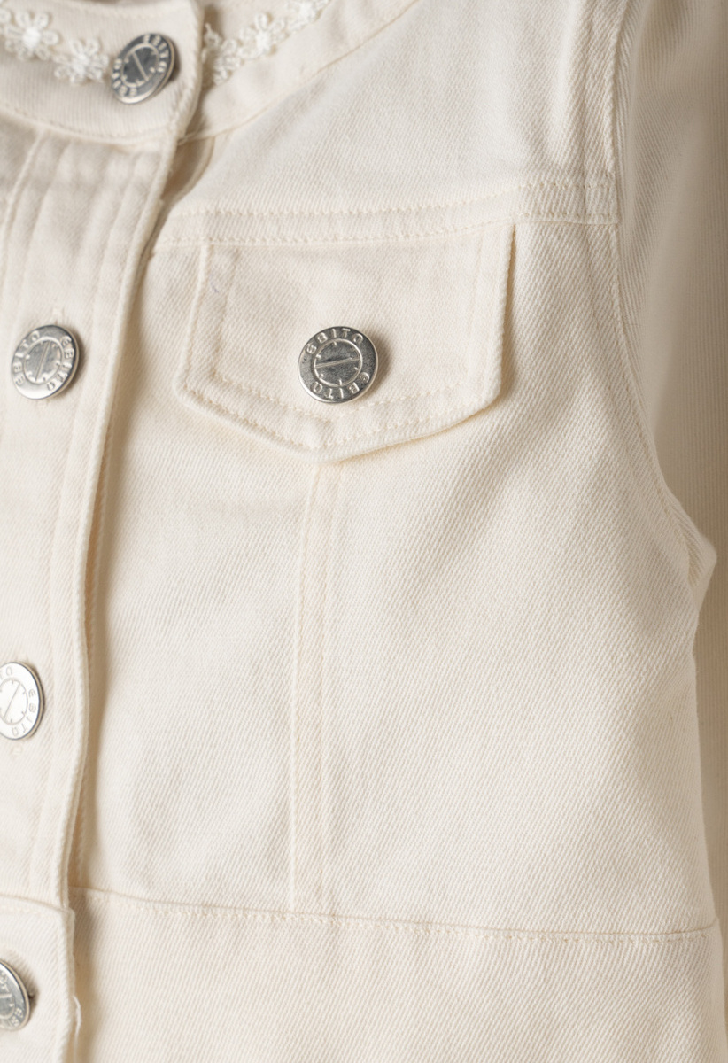 Μπουφάν τζιν ΕΒΙΤΑ σε χρώμα εκρού απαλό με γιακά μάο και διακοσμητικά ανάγλυφα λουλούδια.