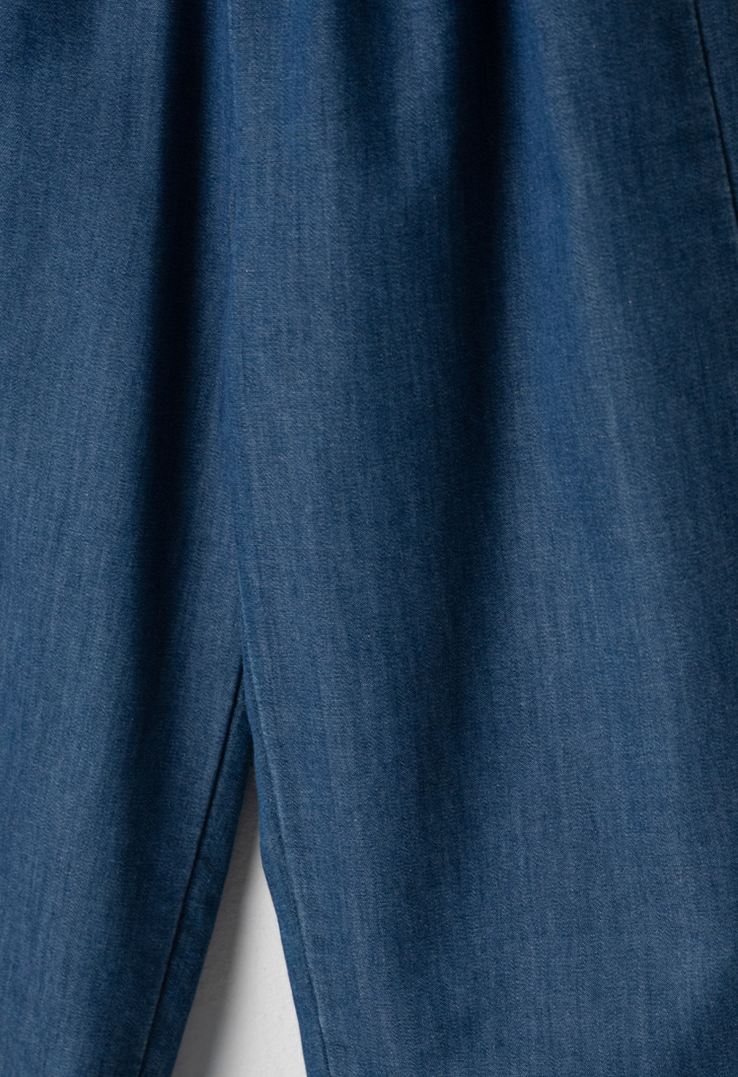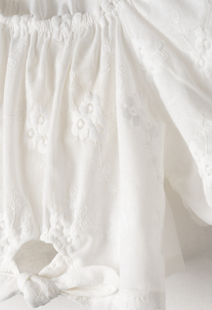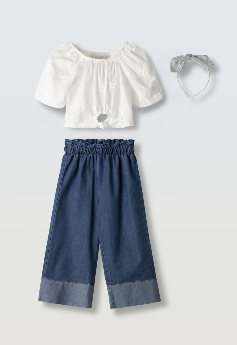 Σετ παντελόνα ΕΒΙΤΑ, μπλούζα τοπ σε λευκό χρώμα με διακριτικές κεντητές διάτρητες λεπτομέρειες, δέσιμο στο κάτω μέρος, μανίκια τύπου baloon και παντελόνα τύπου τζιν με μαλακό ύφασμα, λάστιχο στη μέση και γυρισμένα ρεβέρ. Διαθέτει ασορτί στέκα για τα μαλλιά.