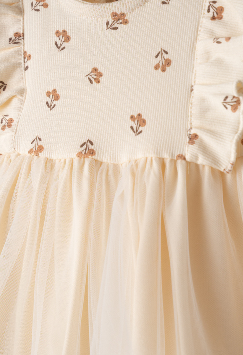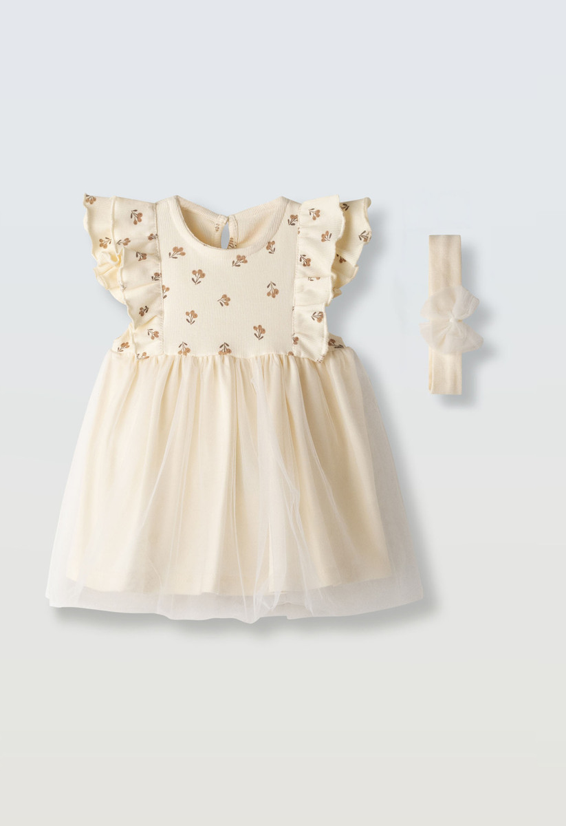 Φόρεμα ΕΒΙΤΑ σε χρώμα μπεζ, ριπ ύφασμα στο μπούστο με all over τύπωμα λουλούδια, διακοσμητικά βολάν στο μπροστινό μέρος, τούλινο τελείωμα και εσωτερική βαμβακερή επένδυση. Διαθέτει ασορτί κορδέλα για τα μαλλιά.