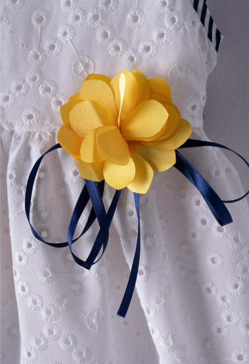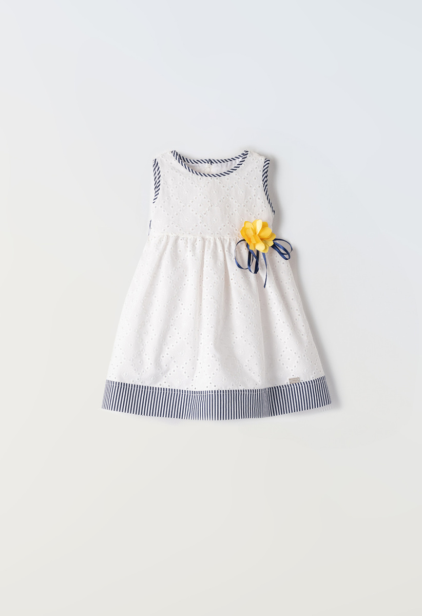 Βαμβακερό φόρεμα ΕΒΙΤΑ, με κιπουρ δαντέλα σε χρώμα λευκό με μπλε σκούρο ριγέ λεπτομέρειες και διακοσμητικό λουλούδι στο μπροστινό μέρος. Διαθέτει κούμπωμα στο πίσω μέρος με κουμπιά και ασορτί κορδέλα.