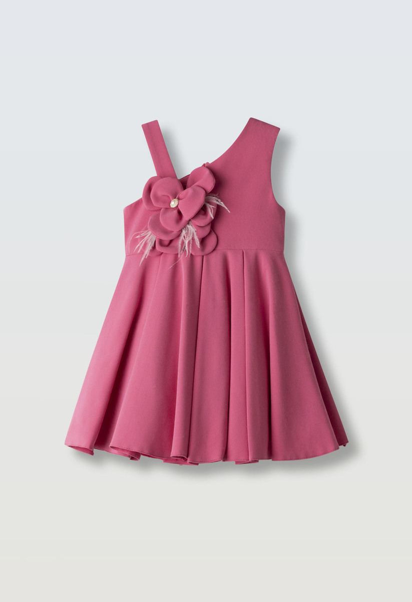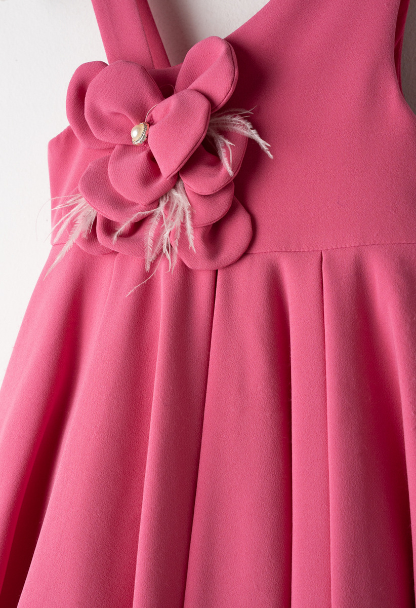 Φόρεμα ΕΒΙΤΑ σε χρώμα φούξια με ιδιαίτερες διαφορετικές τιράντες, διακοσμητικό τρισδιάστατο λουλούδι στο μπούστο, πλισέ τελείωμα με εσωτερική επένδυση από τούλι που προσδίδει όγκο και κίνηση. Διαθέτει κούμπωμα στο πίσω μέρος με φερμουάρ.