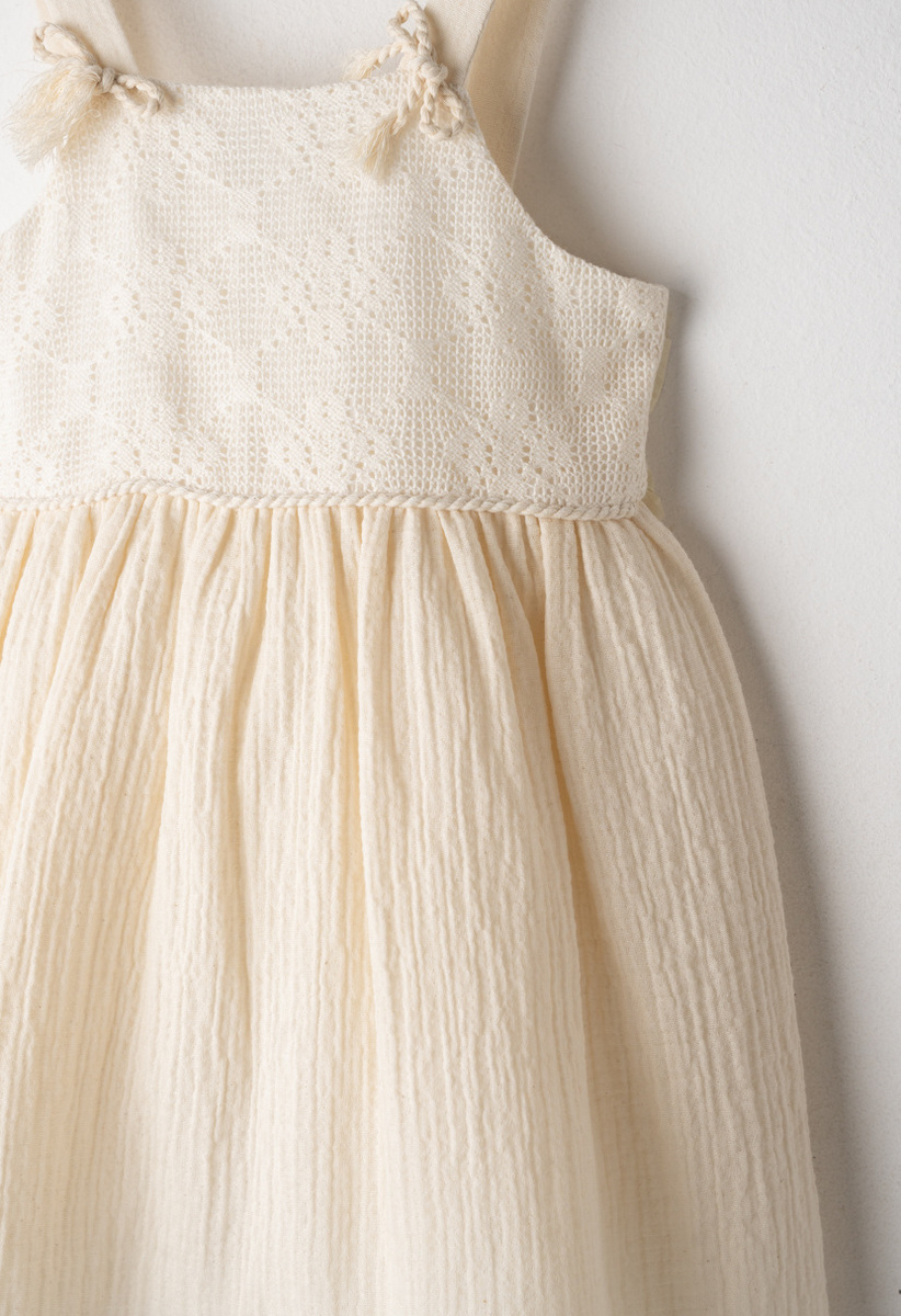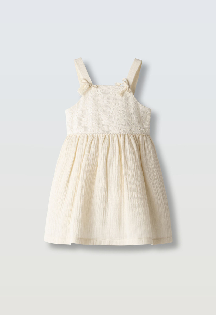Φόρεμα ΕΒΙΤΑ σε χρώμα εκρού με κεντητό μπούστο, διακοσμητικούς φιόγκους στις τιράντες και βαμβακερό γκοφρέ τελείωμα. Διαθέτει κλείσιμο με φερμουάρ στο πίσω μέρος.