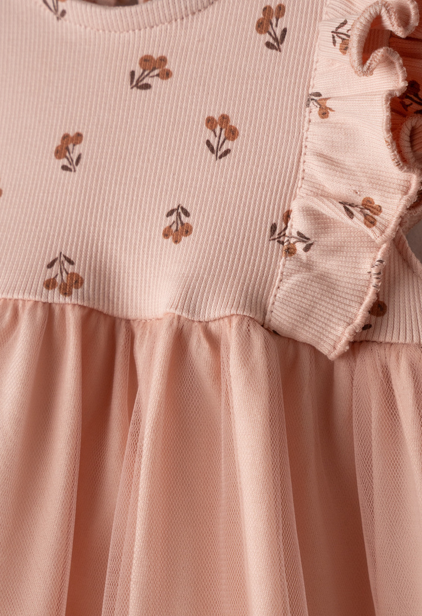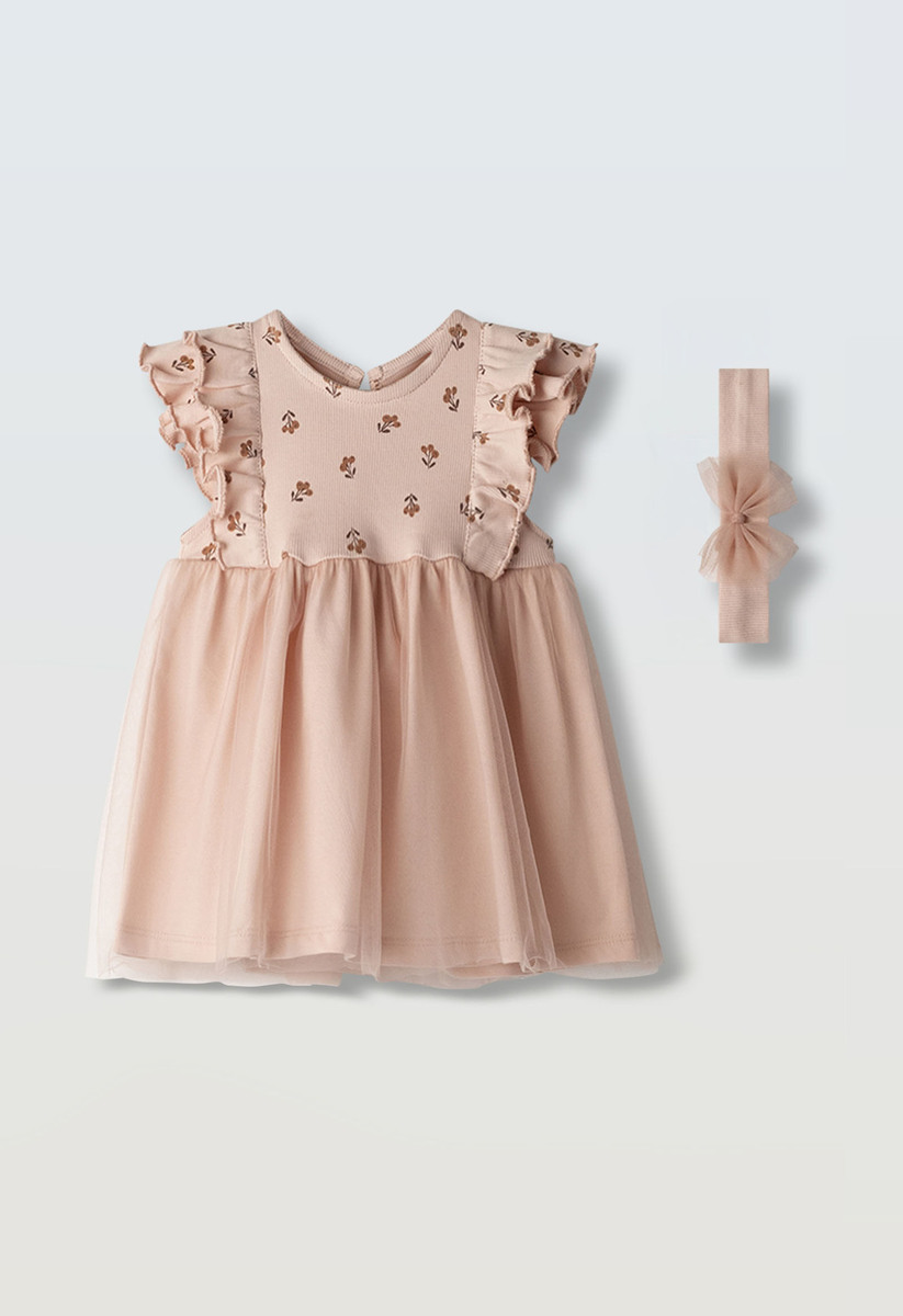 Φόρεμα ΕΒΙΤΑ σε ροζ σκούρο χρώμα, ριπ ύφασμα στο μπούστο με all over τύπωμα λουλούδια, διακοσμητικά βολάν στο μπροστινό μέρος, τούλινο τελείωμα και εσωτερική βαμβακερή επένδυση. Διαθέτει ασορτί κορδέλα για τα μαλλιά.