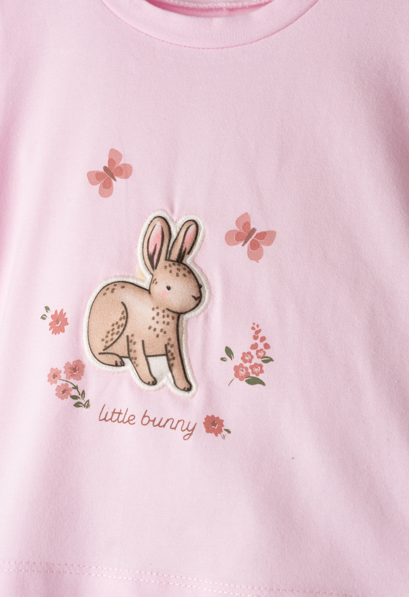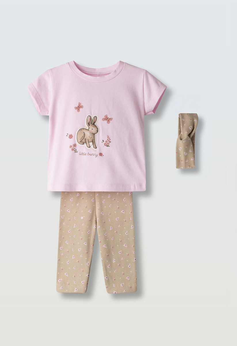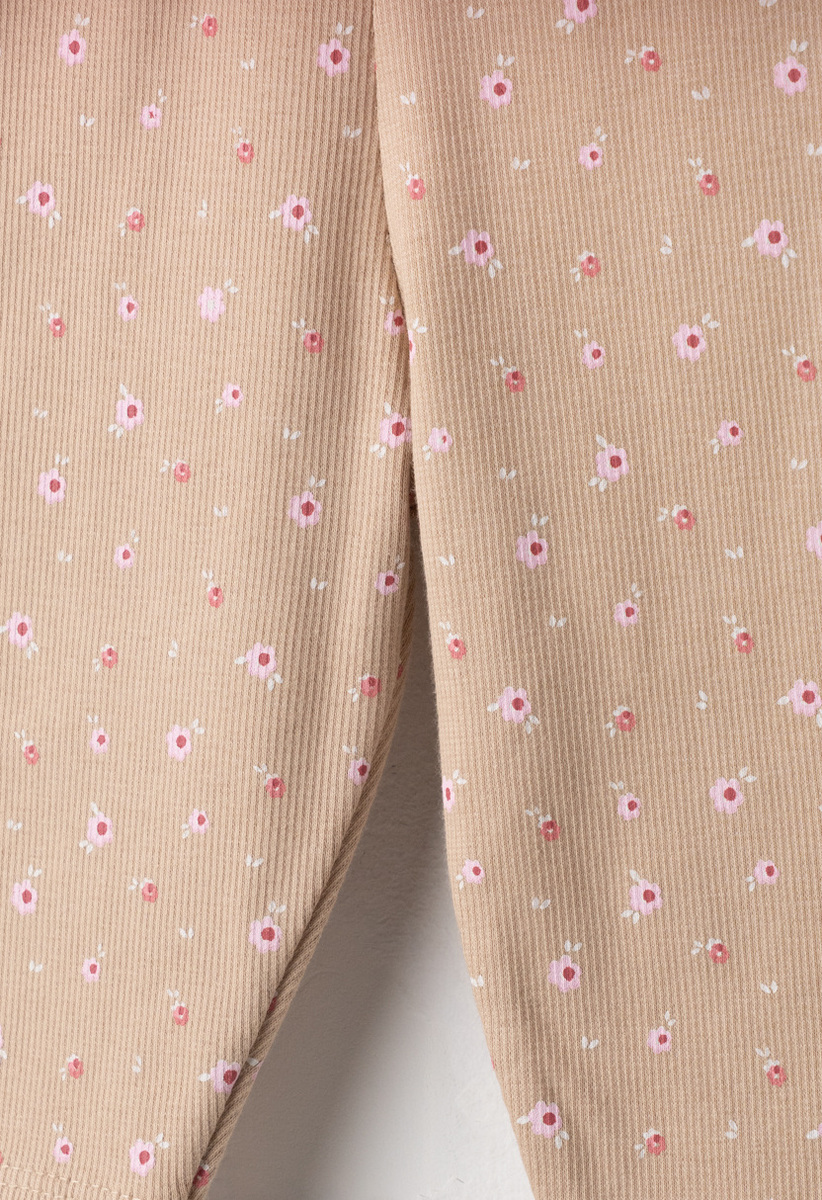 Σετ κολάν ΕΒΙΤΑ, μπλούζα σε ροζ χρώμα με τύπωμα στο μπροστινό μέρος και κολάν ριπ κάπρι σε μπεζ χρώμα με all over τύπωμα λουλούδια. Διαθέτει ασορτί κορδέλα για τα μαλλιά.