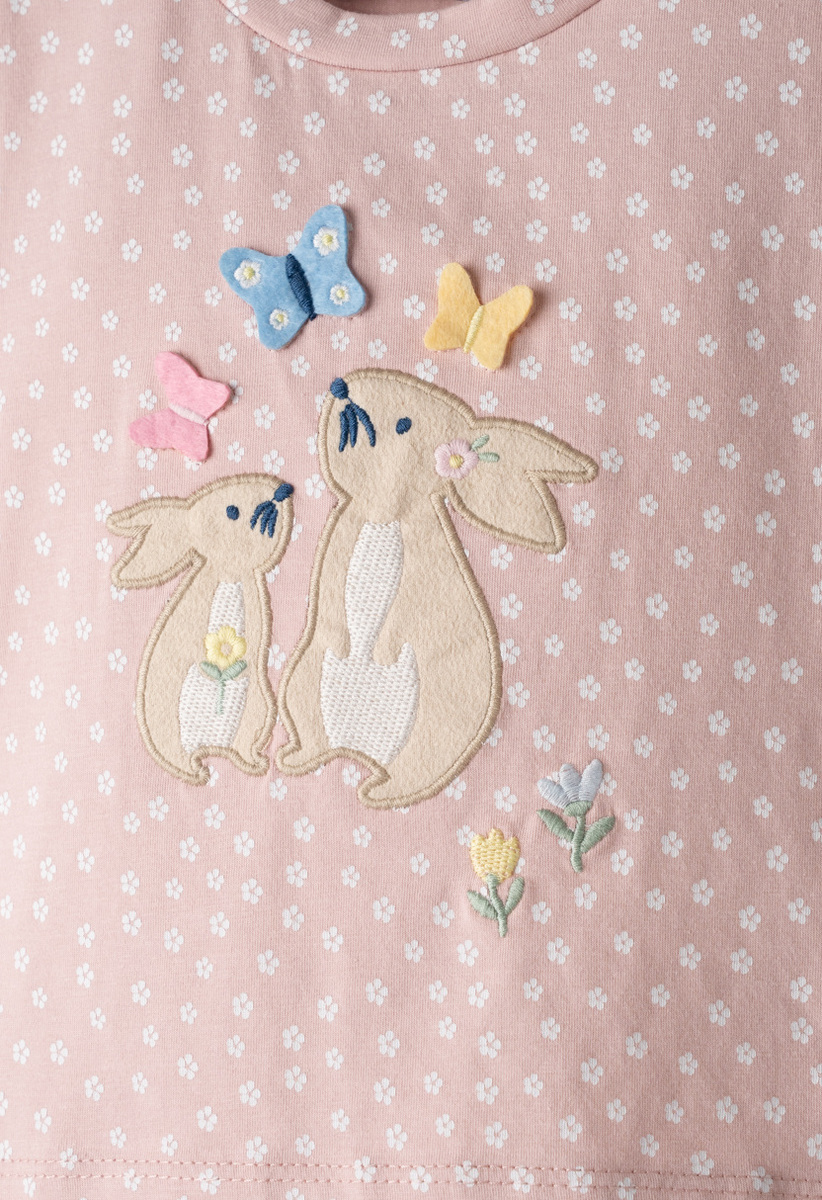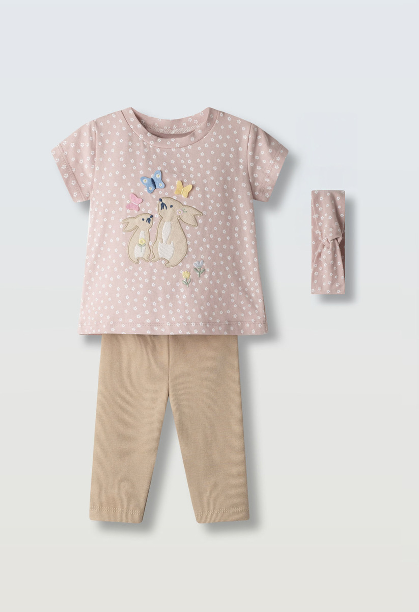 Σετ κολάν ΕΒΙΤΑ, μπλούζα με κοντό μανίκι σε χρώμα σκούρο ροζ με απλικέ λεπτομέρειες στο μπροστινό μέρος και κολάν βαμβακερό ριπ σε μπεζ χρώμα. Διαθέτει ασορτί κορδέλα για τα μαλλιά.