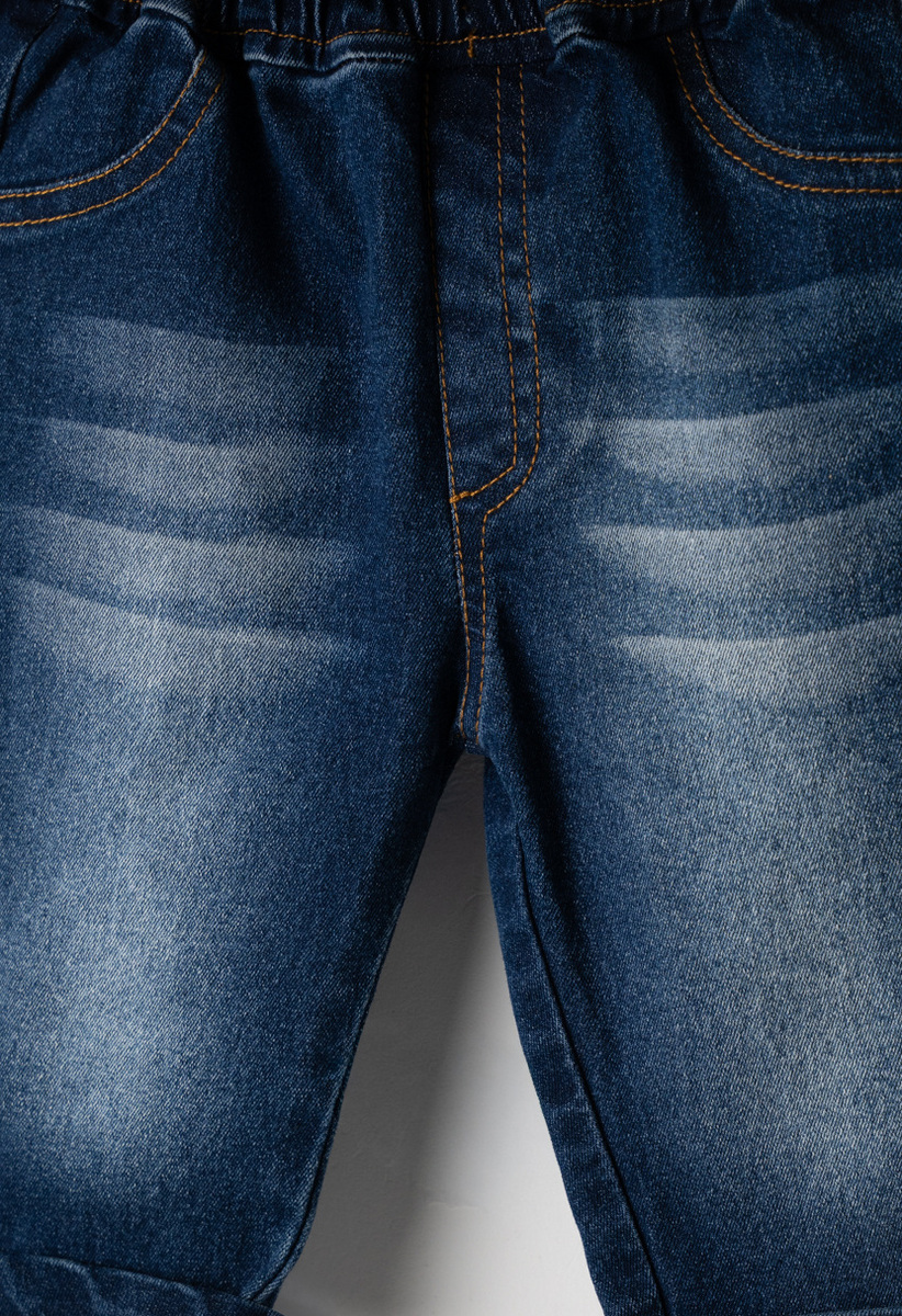 Σετ παντελόνι τριών τεμαχίων ΕΒΙΤΑ, εποχιακό μπουφάν με γιακά σε εκρού χρώμα, μπροστινό κούμπωμα με κουμπιά και δύο εξωτερικές τσέπες. Μπλούζα κοντομάνικη σε χρώμα εκρού με τύπωμα στο μπροστινό μέρος και παντελόνι τζιν με λάστιχο στη μέση.