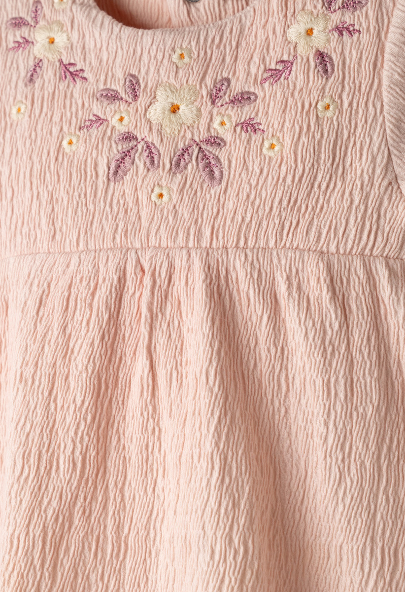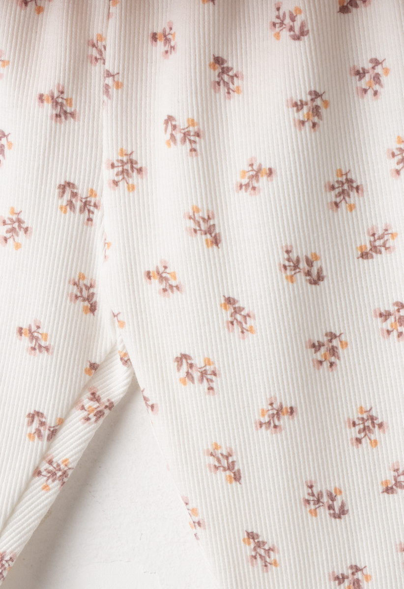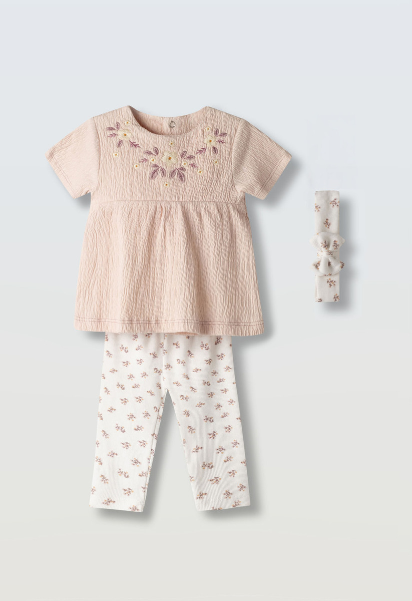 Σετ κολάν ΕΒΙΤΑ, μπλούζα σε χρώμα ροζ ανοιχτό με κεντητές λεπτομέρειες και κολάν ριπ με all-over τύπωμα λουλουδάκια σε χρώμα εκρού. Διαθέτει ασορτί κορδέλα για τα μαλλιά.