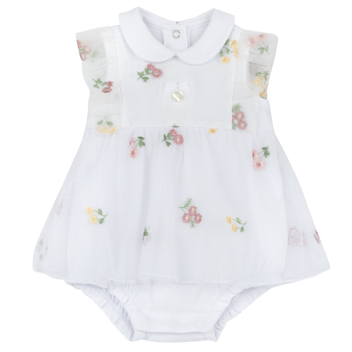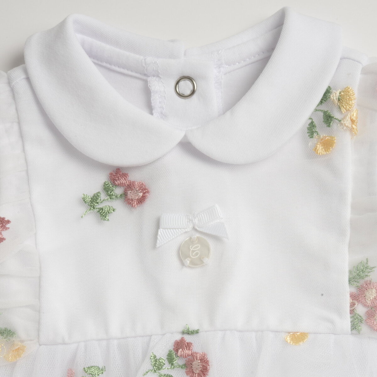 Βαμβακερό φορμάκι CHICCO σε λευκό χρώμα με τούλινη εξωτερική επένδυση διακοσμημένη με κεντητά λουλουδάκια, λευκό γιακαδάκι και βολάν στα μανίκια. Διαθέτει κλείσιμο με κουμπιά-τρουκς στην πλάτη και στο κάτω μέρος.
