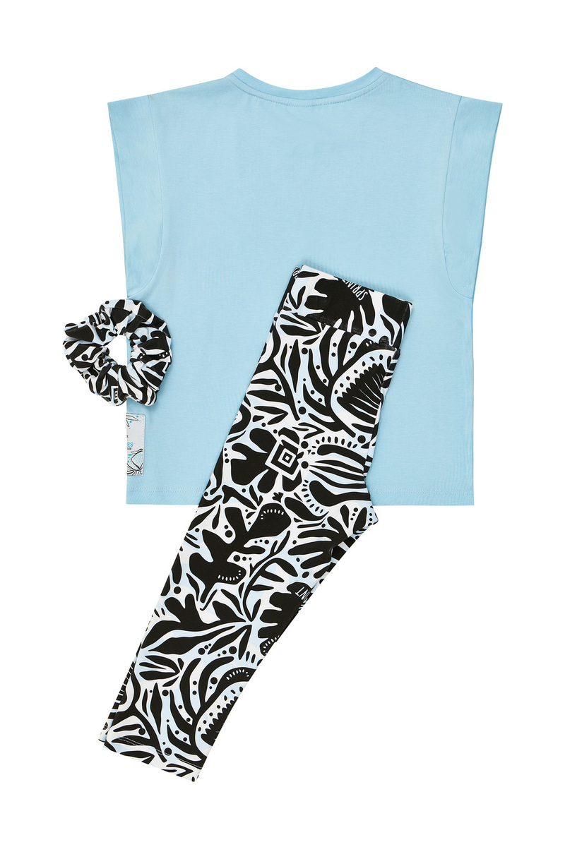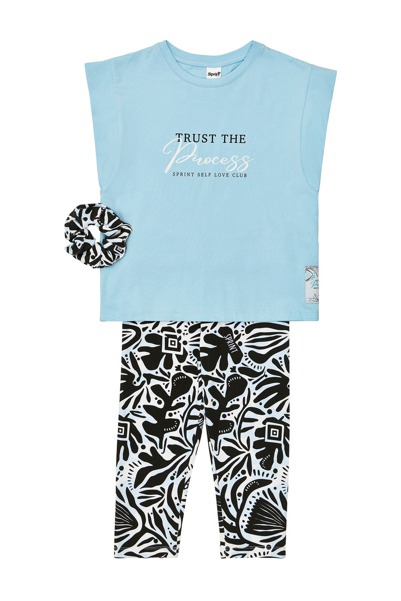 Σετ κολάν SPRINT, μπλούζα αμάνικη σε χρώμα γαλάζιο με τύπωμα στο μπροστινό μέρος και κολάν κάπρι εμπριμέ σε χρώμα μαύρο. Διαθέτει ασορτί λάστιχο για τα μαλλιά.