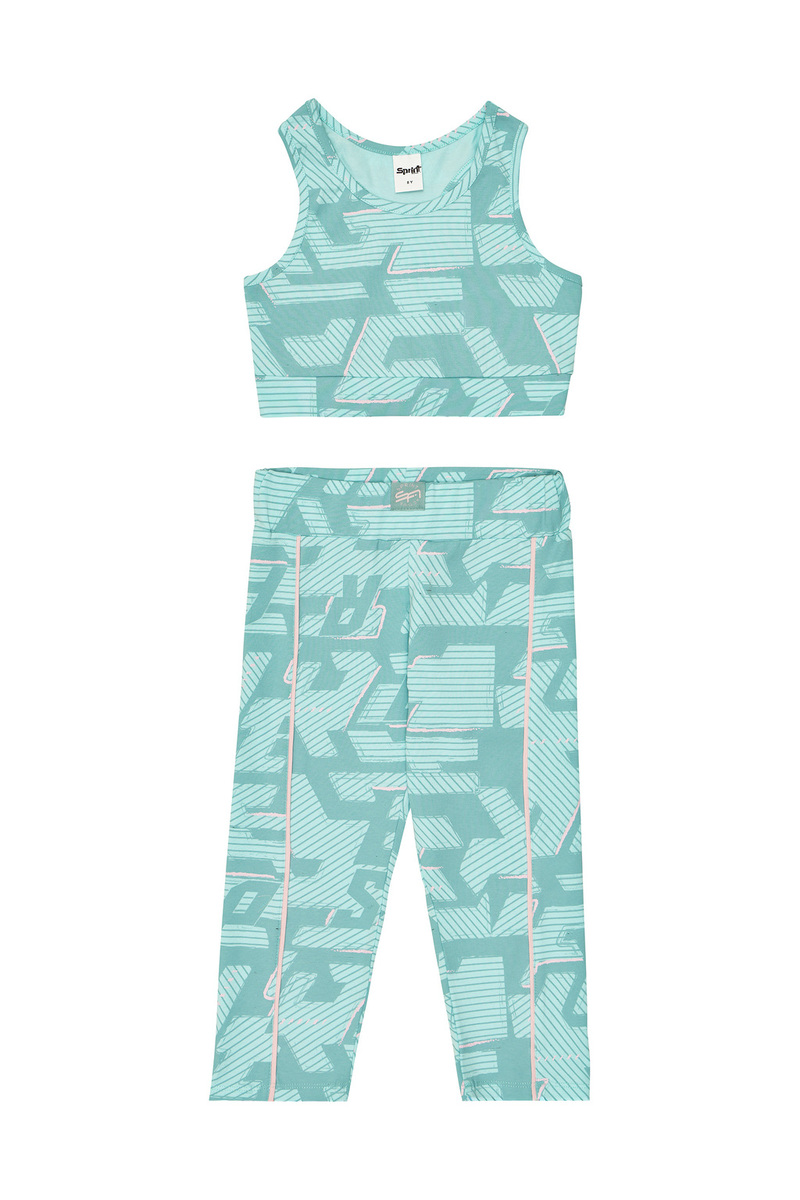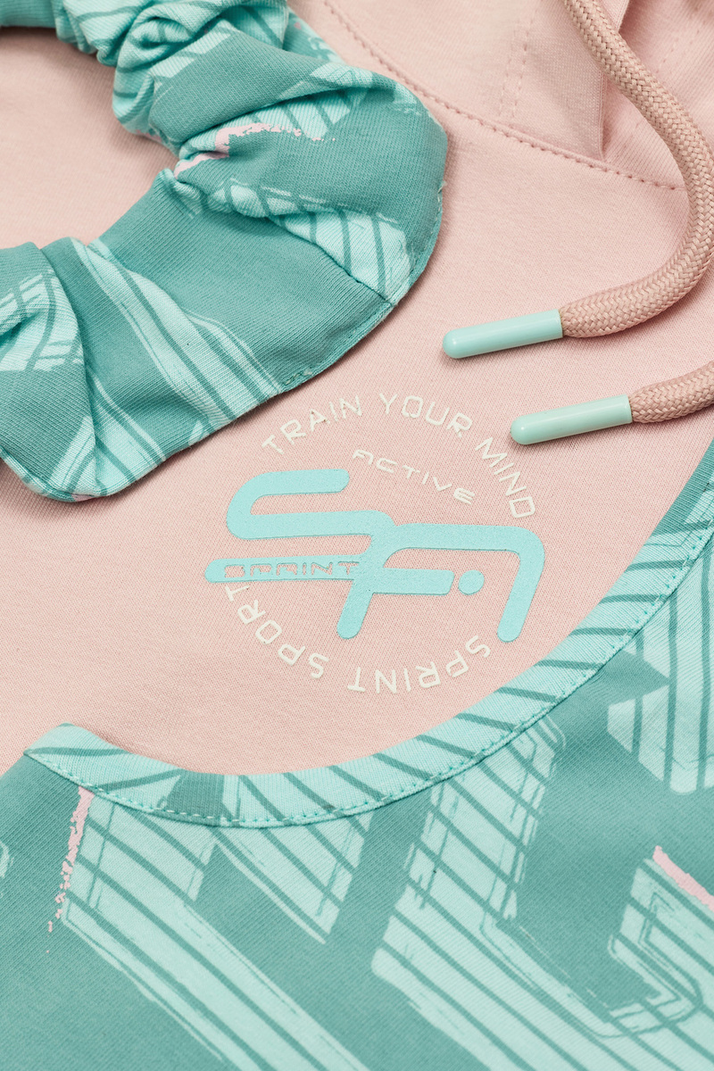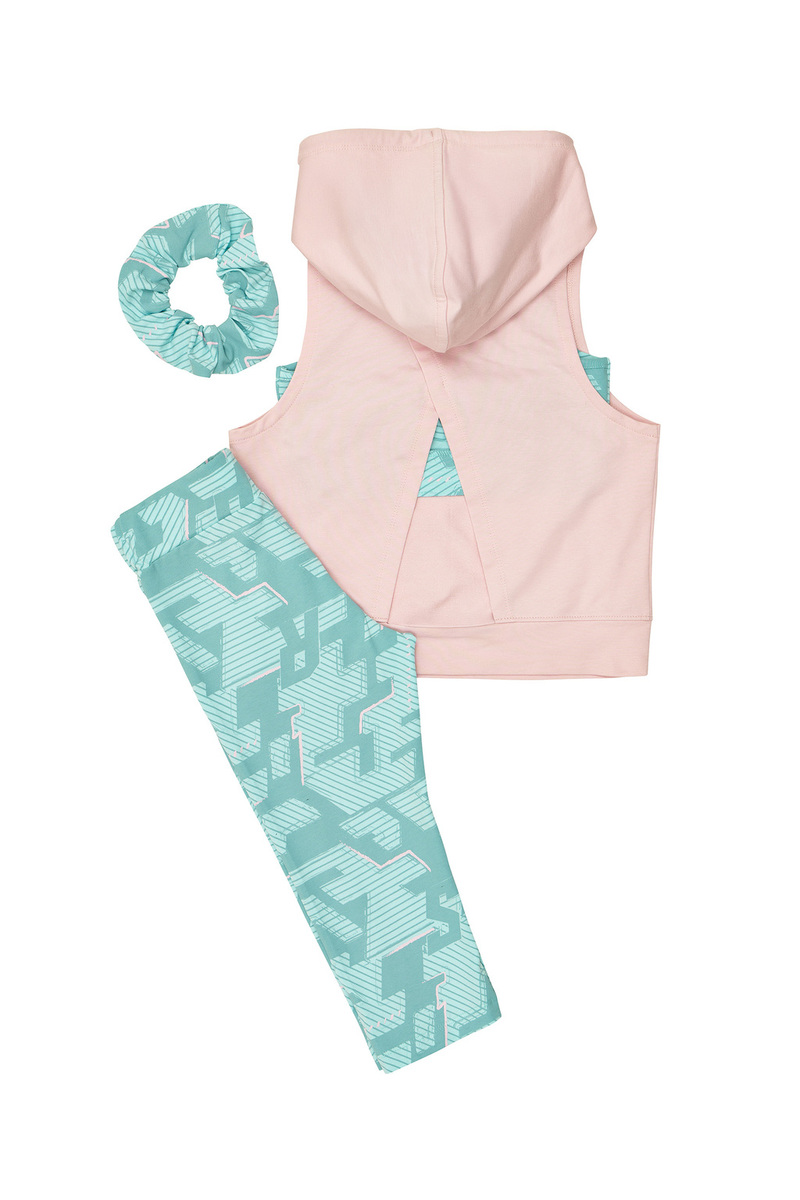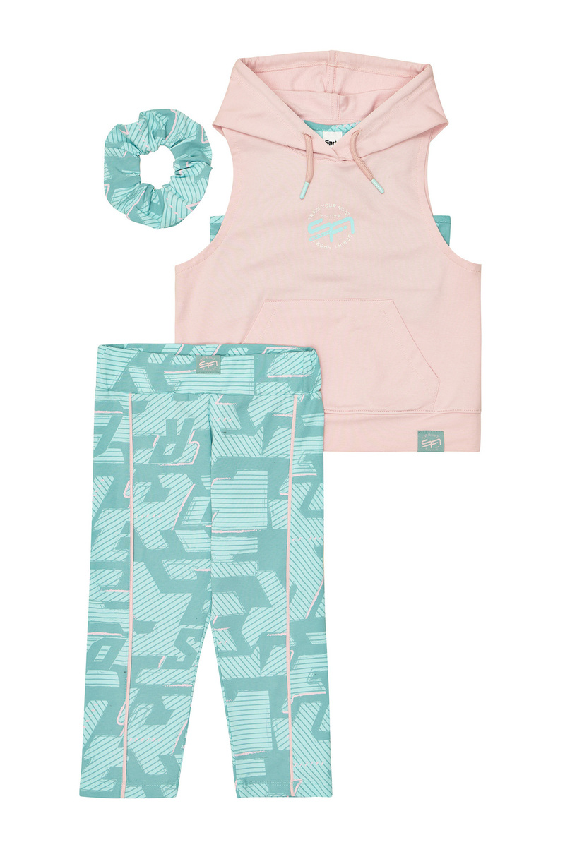 Σετ κολάν 3 τεμαχίων SPRINT, μπλούζα αμάνικη σε χρώμα ροζ ανοιχτό με ενσωματωμένη κουκούλα, αθλητικό μπουστάκι και κολάν κάπρι εμπριμέ σε χρώμα βεραμάν. Διαθέτει ασορτί λάστιχο για τα μαλλιά.