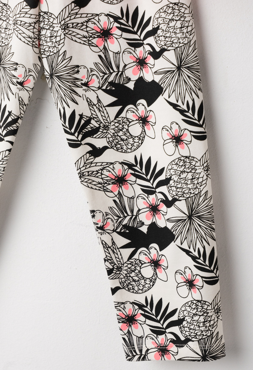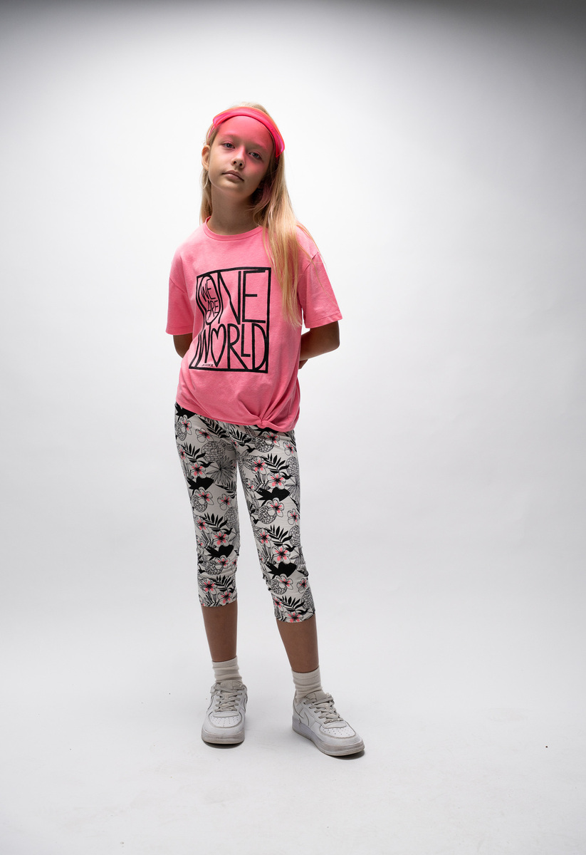 Σετ κολάν ΕΒΙΤΑ, μπλούζα σε χρώμα ροζ φλούο, τύπωμα με γκλίτερ στο μπροστινό μέρος και κολάν κάπρι εμπριμέ με λάστιχο στη μέση σε χρώμα εκρού-μαύρο.