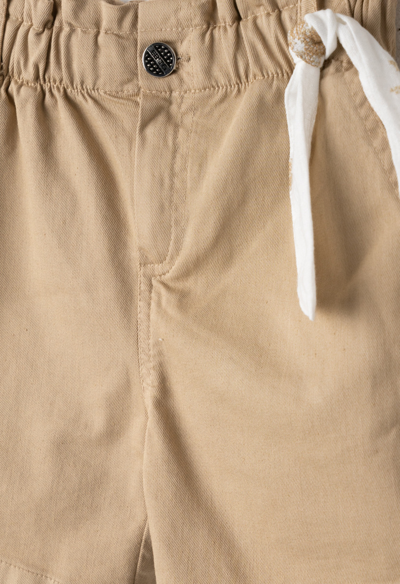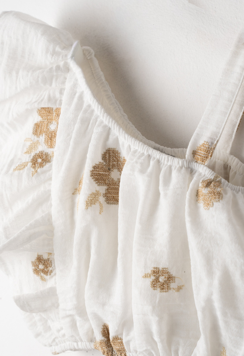 Σετ σορτς ΕΒΙΤΑ, μπλούζα κοντή σε λευκό χρώμα με κεντητά λουλούδια, ιδιαίτερα διαφορετικά μανίκια και σορτς με λάστιχο στη μέση σε χρώμα μπεζ. Διαθέτει κούμπωμα με φερμουάρ και διακοσμητικό δέσιμο.