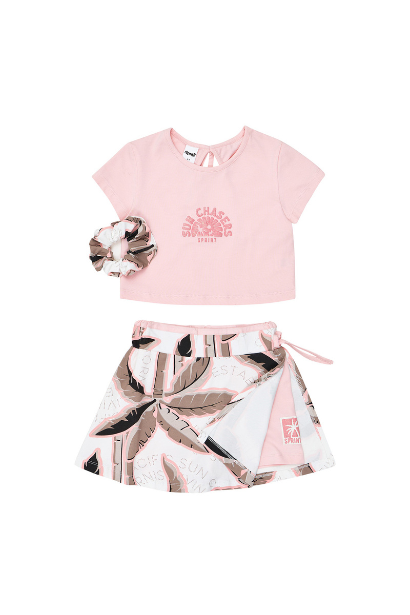 Σετ SPRINT, μπλούζα σε χρώμα ροζ με ιδιαίτερο άνοιγμα στην πλάτη και φούστα-σορτς με δέσιμο στο πλάι και all-over τύπωμα σε χρώμα εκρού. Διαθέτει ασορτί λάστιχο για τα μαλλιά.