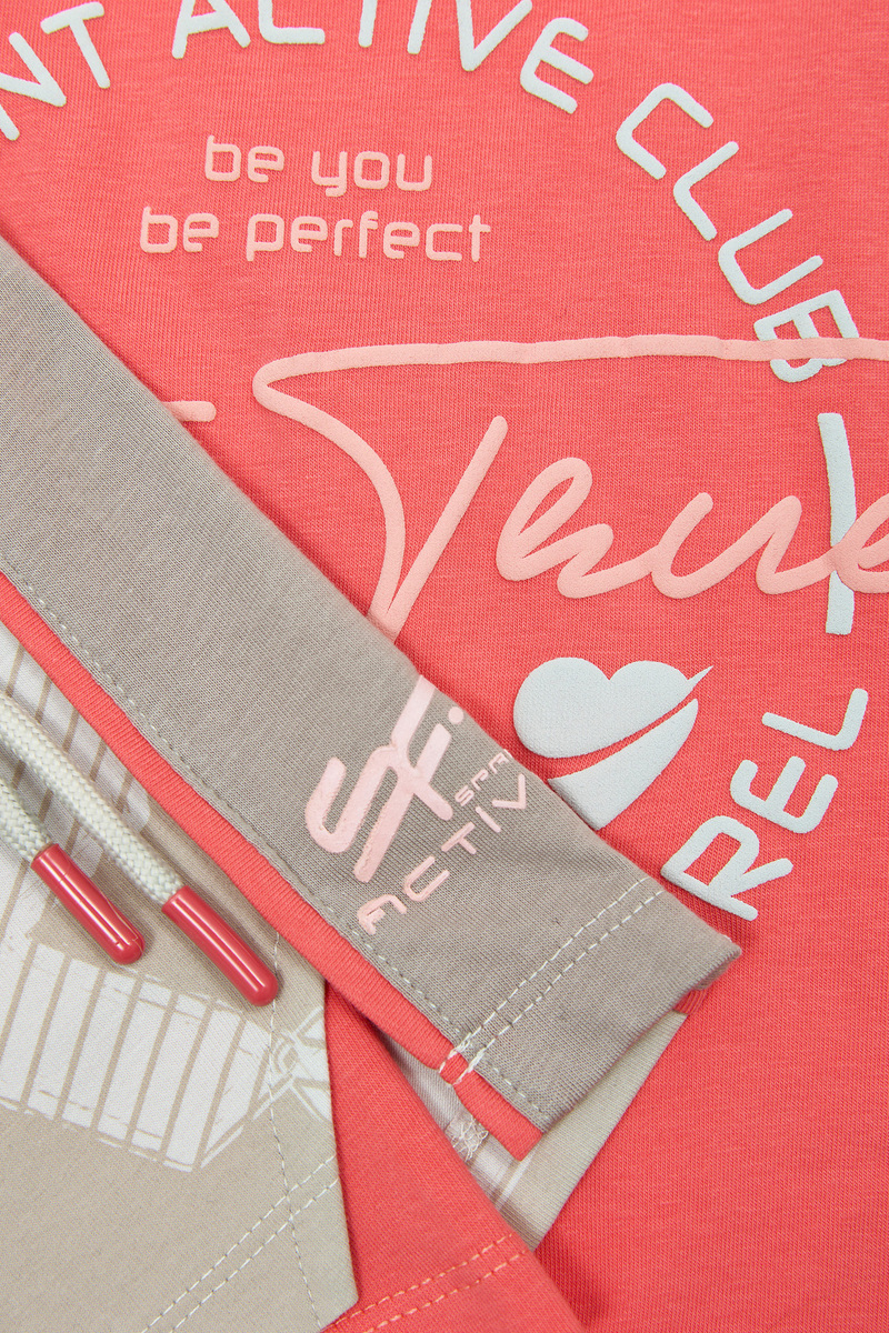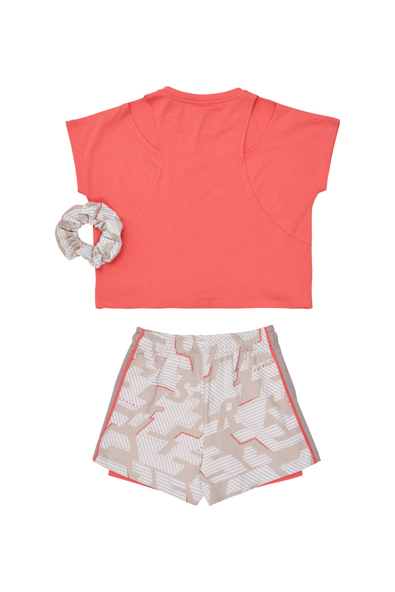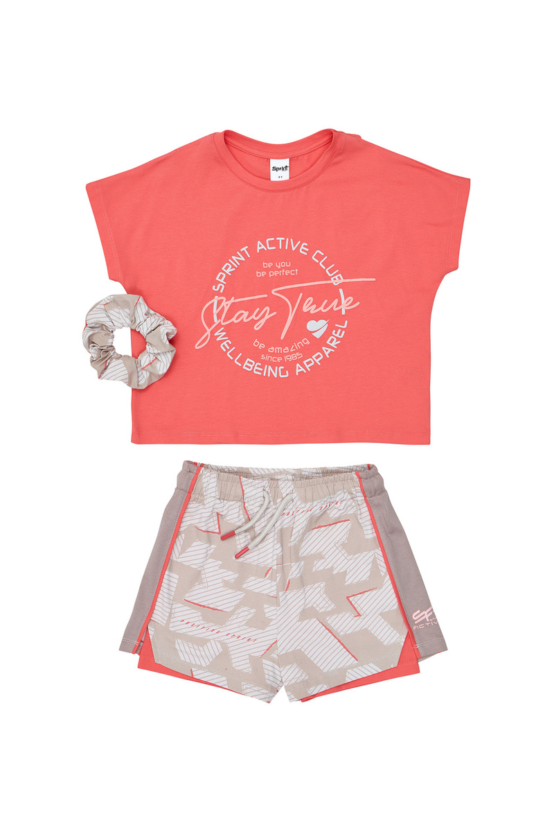 Σετ SPRINT, μπλούζα σε χρώμα κοραλί με τύπωμα στο μπροστινό μέρος και σορτς εμπριμέ με ενσωματωμένο ποδηλατικό κολάν. Διαθέτει σταθερό λάστιχο στη μέση με ρυθμιζόμενο κορδόνι σε χρώμα μπεζ και ασορτί λάστιχο για τα μαλλιά.
