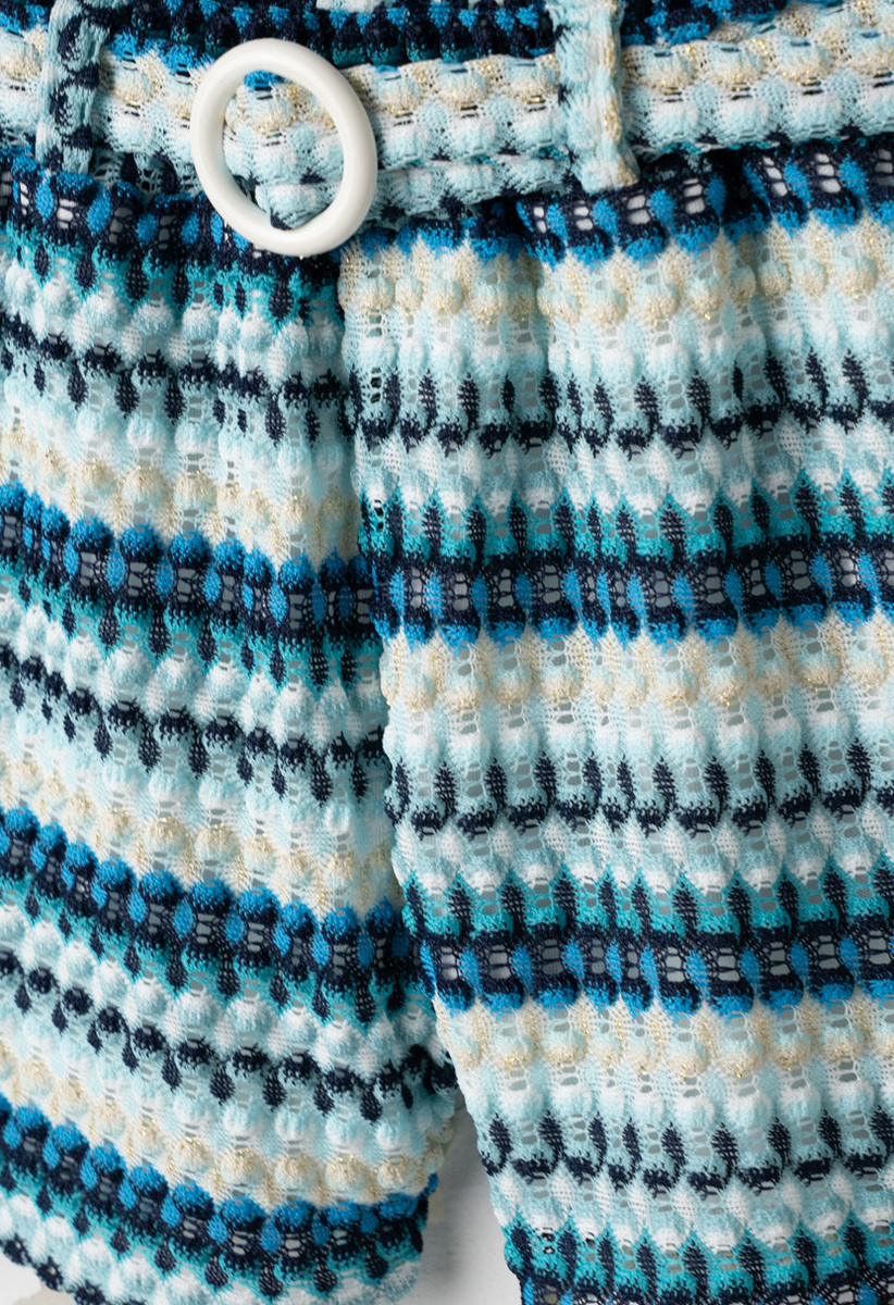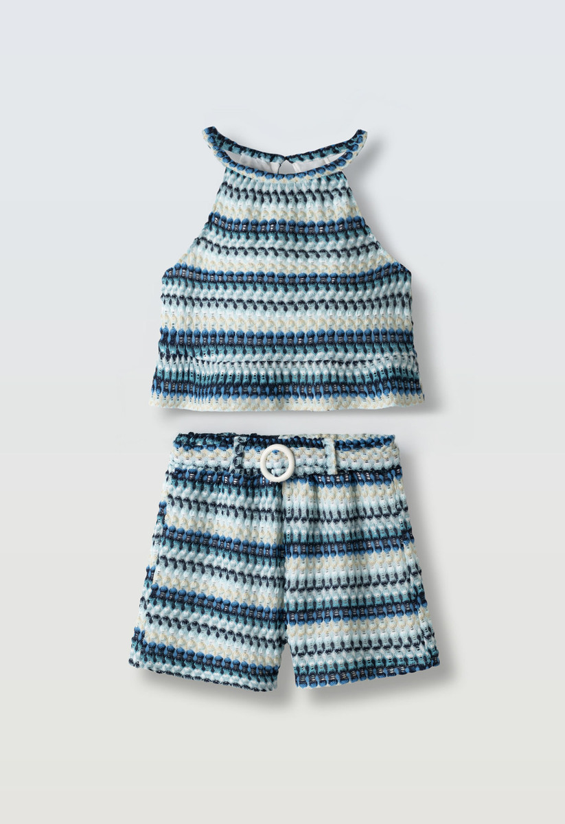 Σετ ΕΒΙΤΑ, μπλούζα πλεκτή με τιράντες, βολάν στο τελείωμα, κλείσιμο με κουμπί στο πίσω μέρος και σορτς με λάστιχο στη μέση. Διαθέτει εσωτερική επένδυση και ασορτί αποσπώμενη ζώνη.