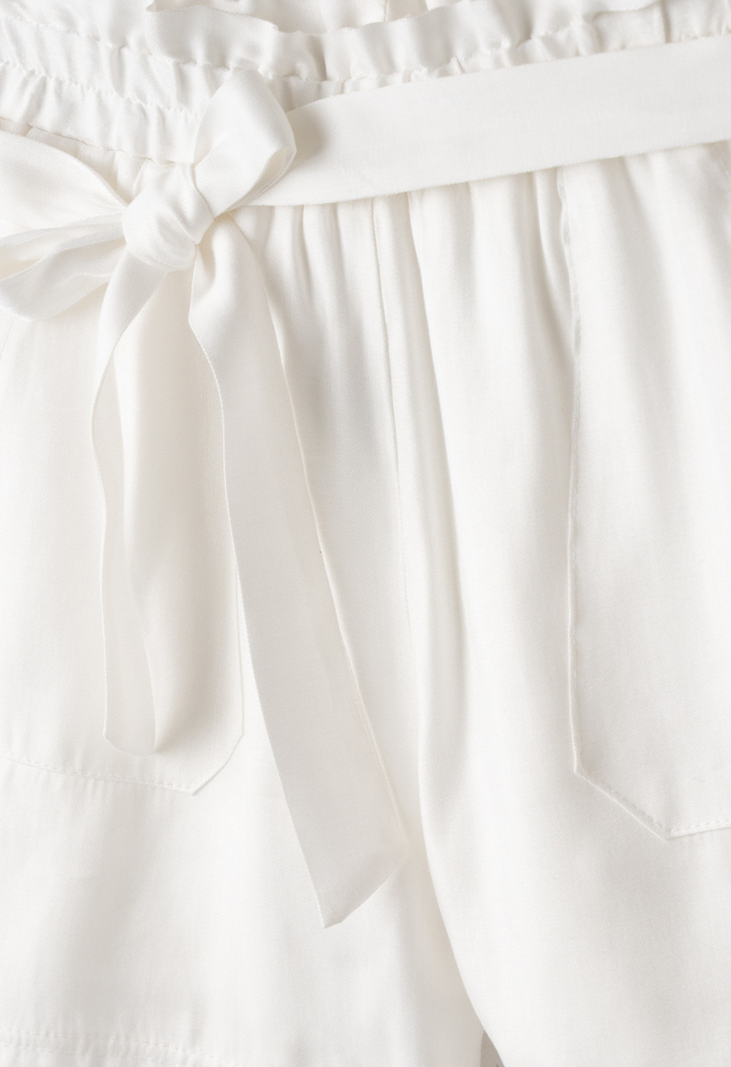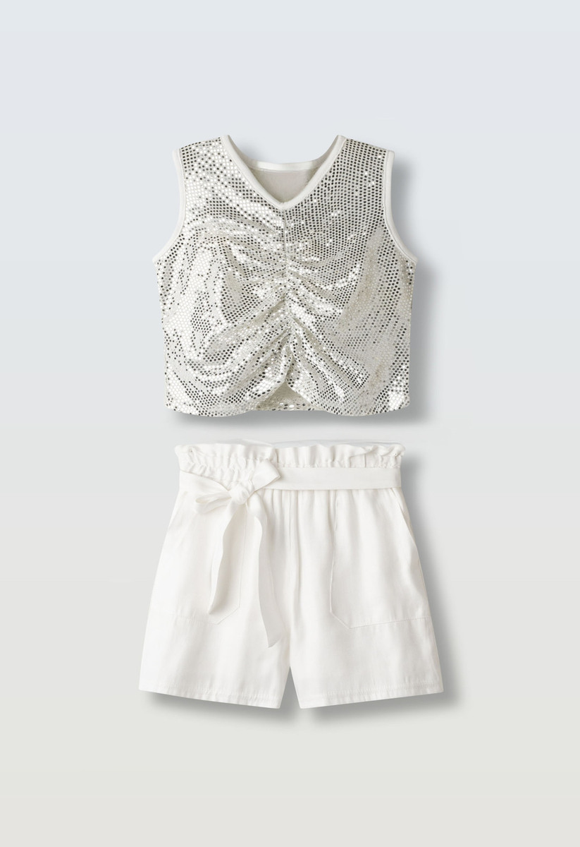 Σετ σορτς ΕΒΙΤΑ, μπλούζα αμάνικη κοντή σε χρώμα λευκό με ασημί παγιέτες, πιάσιμο στο στήθος και σορτς με λάστιχο στη μέση, ασορτί ζώνη και δύο εξωτερικές τσέπες.