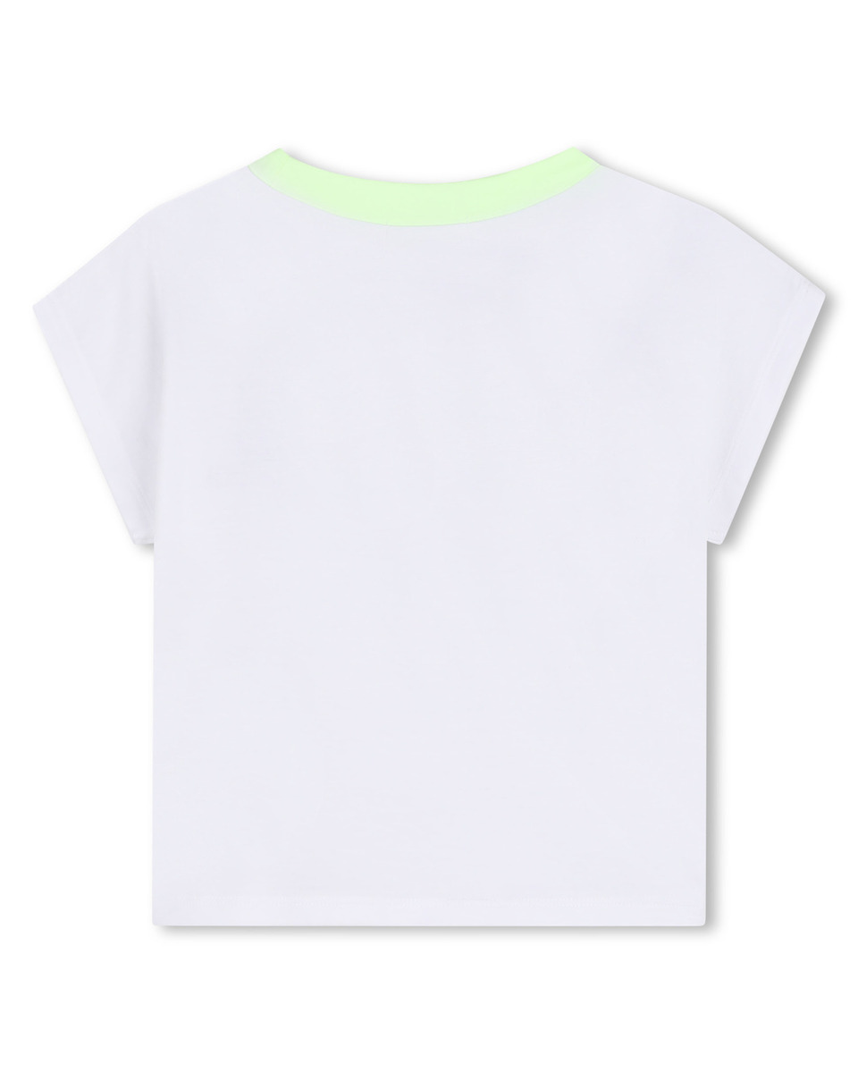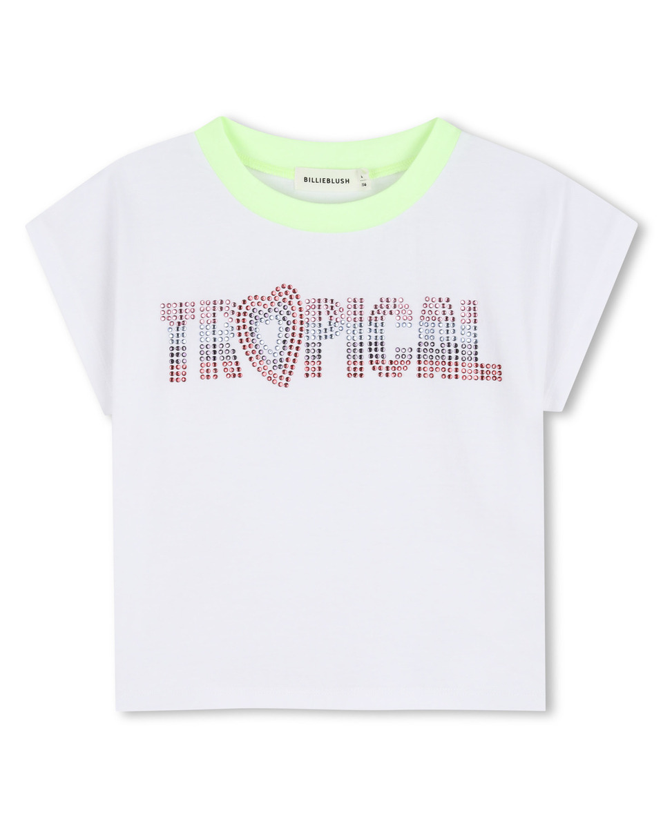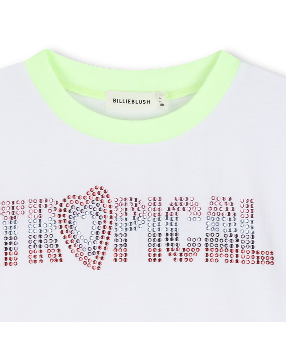 Κοντομάνικη μπλούζα BILLIEBLUSH σε χρώμα λευκό, με στρογγυλή λαιμόκοψη με λάιμ λεπτομέρειες και ανάγλυφο τύπωμα "TROPICAL" με στρας στο μπροστινό μέρος.