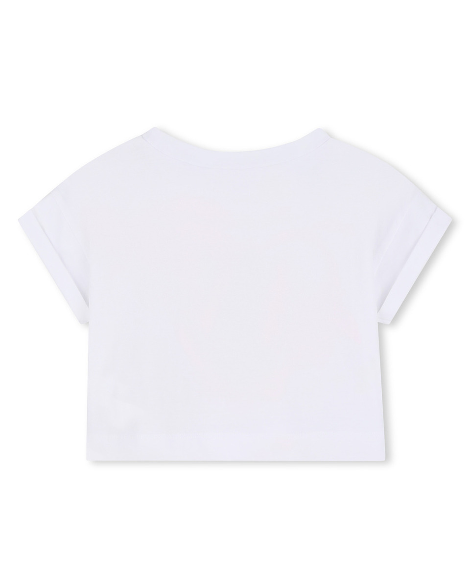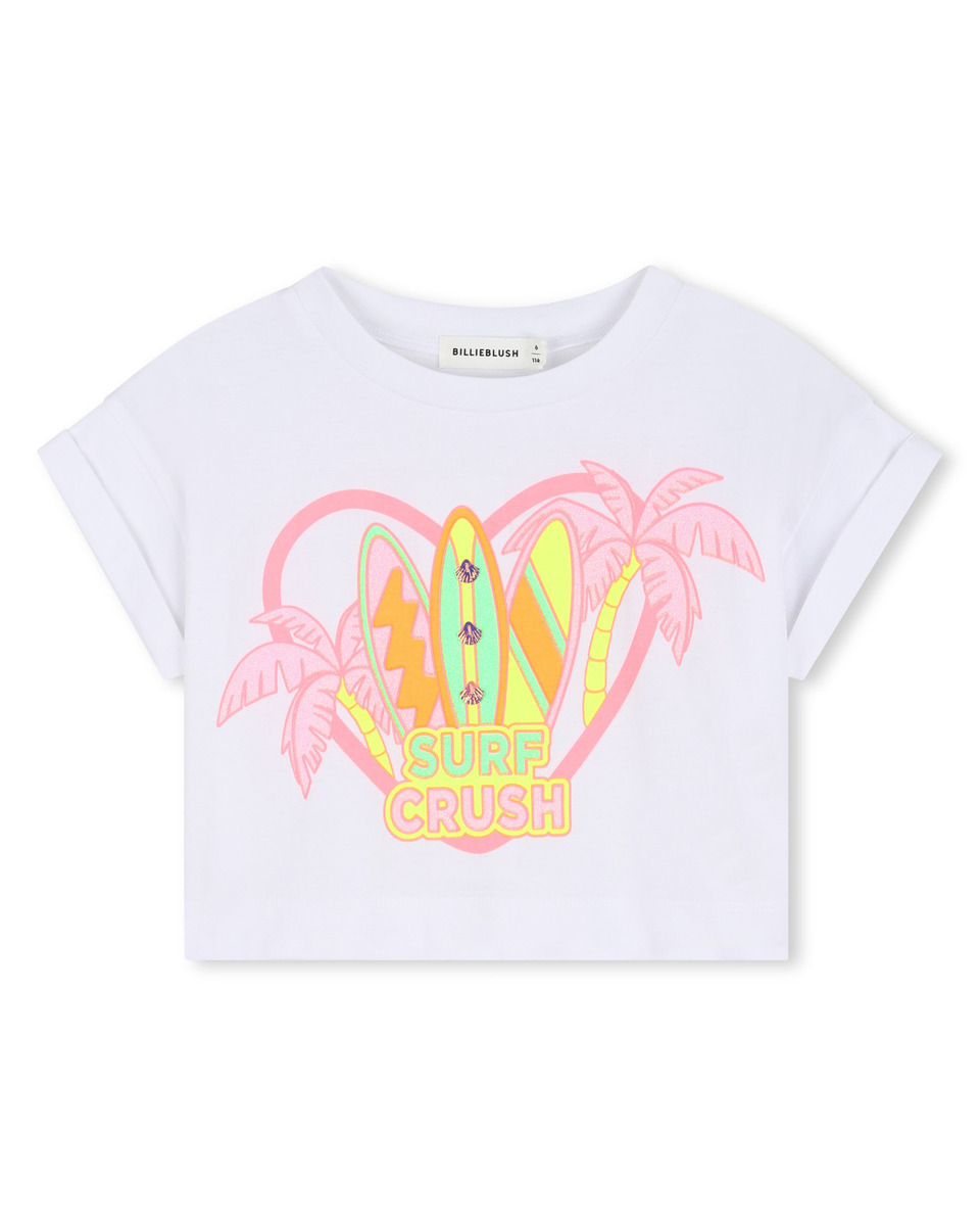 Κοντή Tee-shirt BILLIEBLUSH σε χρώμα λευκό, τύπωμα με γκλίτερ στο μπροστινό μέρος και λεπτομέρειες με τρισδιάστατα κοχύλια. Διαθέτει στρογγυλή λαιμόκοψη και έχει άνετη εφαρμογή.