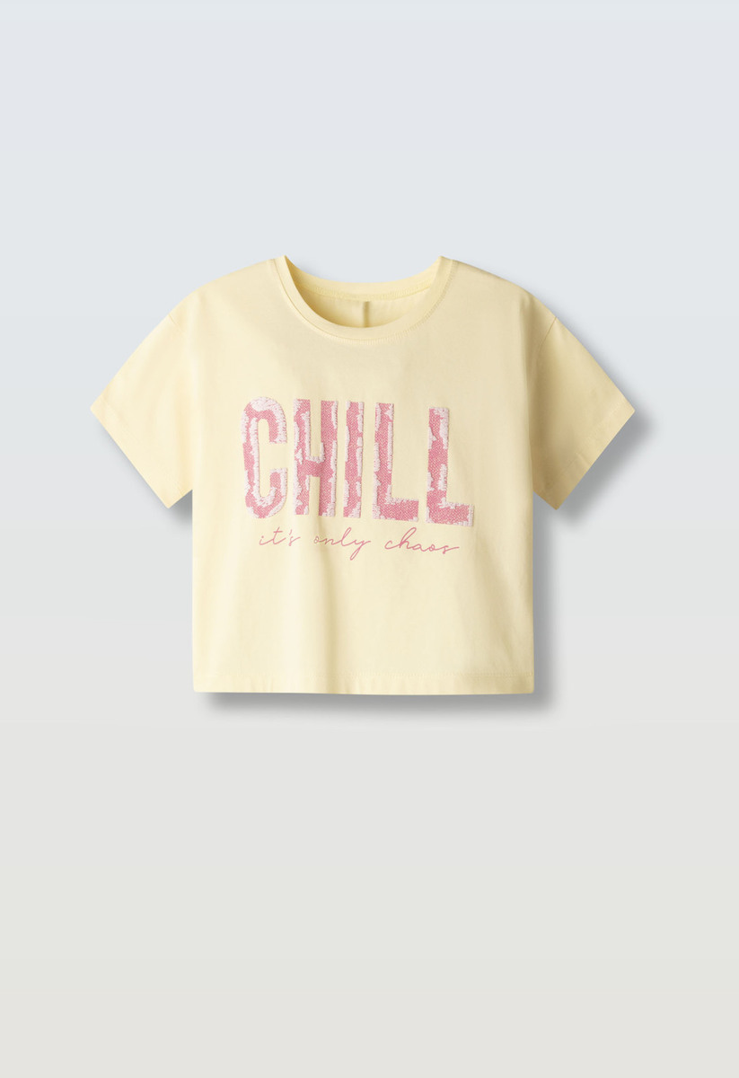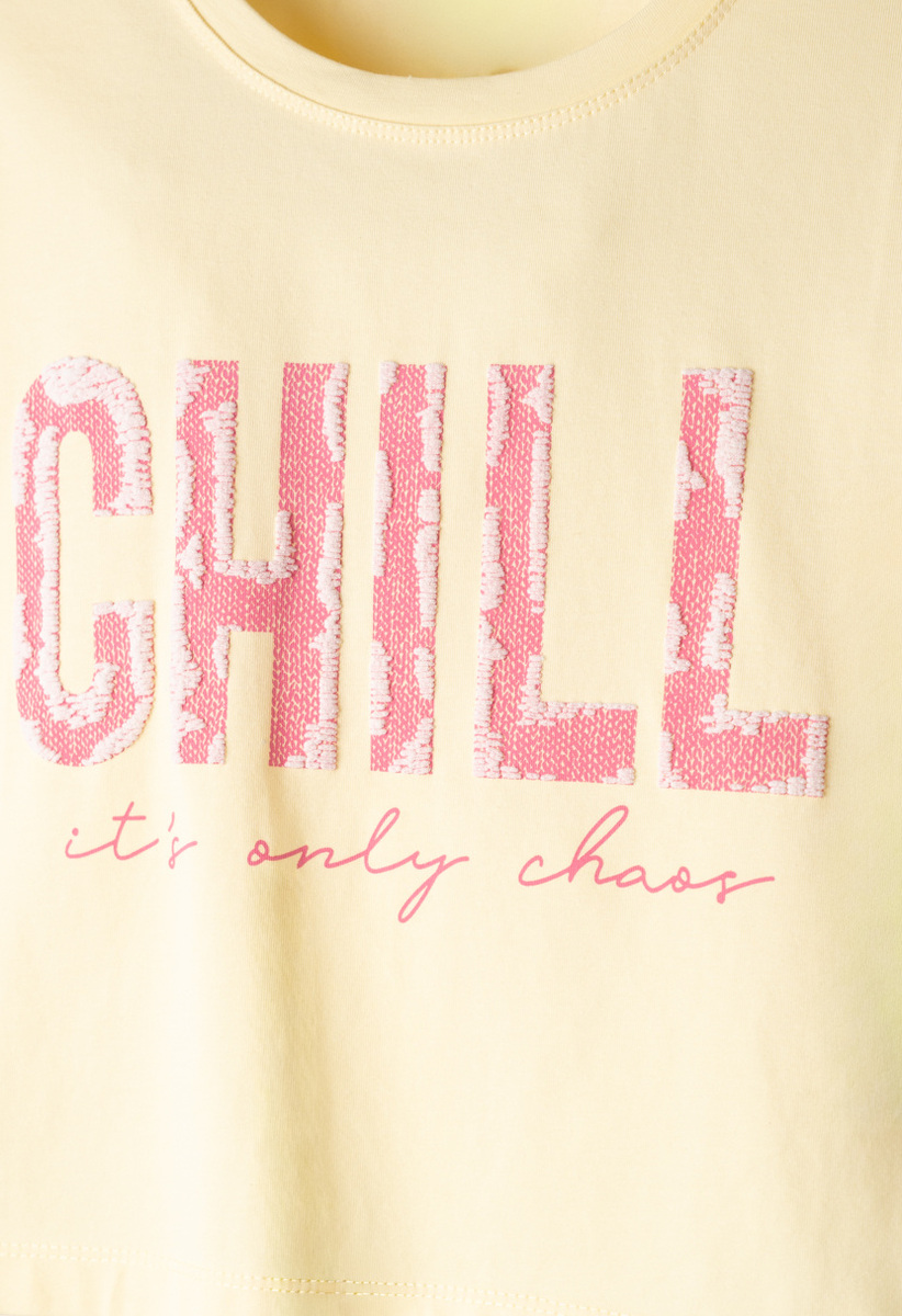 Μπλούζα κοντή βαμβακερή ΕΒΙΤΑ σε χρώμα κίτρινο με στρογγυλή λαιμόκοψη και τύπωμα στο μπροστινό μέρος.
