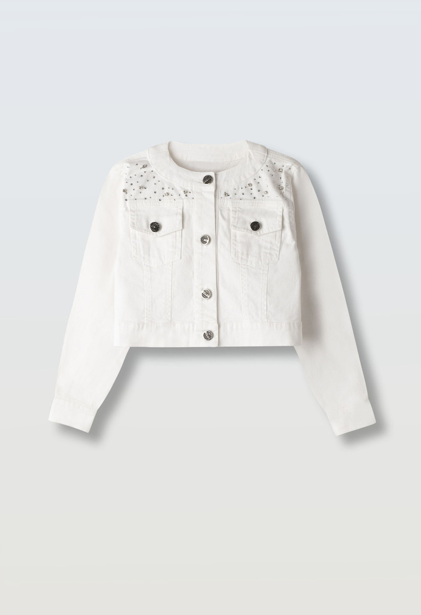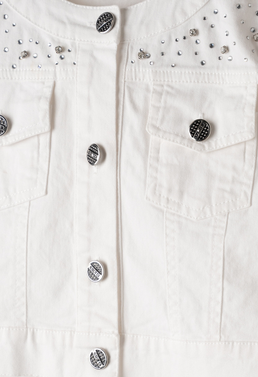 Εποχιακό cropped μπουφάν ΕΒΙΤΑ σε χρώμα λευκό με γιακά μάο και διακοσμητικά στρας.