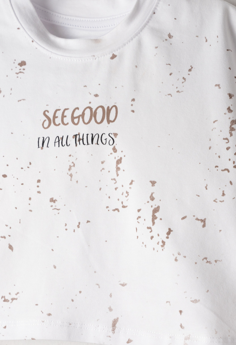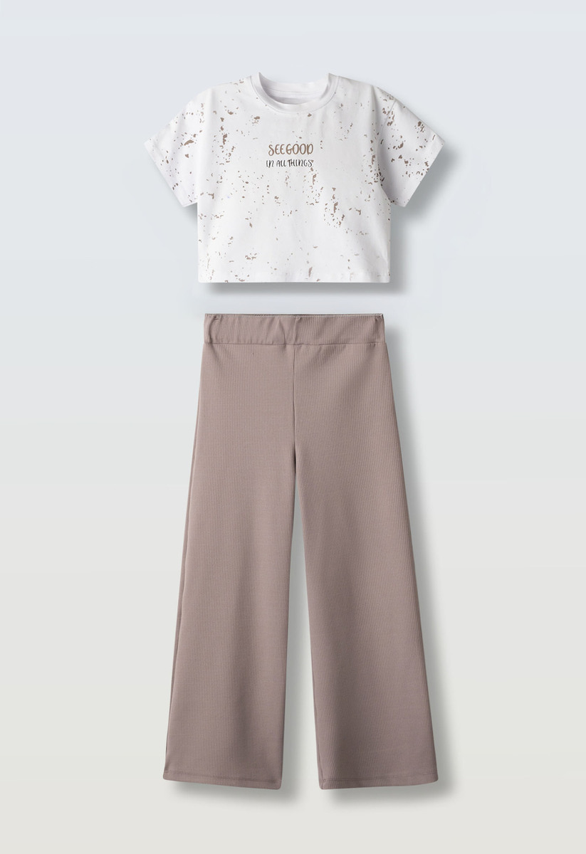 Σετ ΕΒΙΤΑ, μπλούζα κοντή σε λευκό χρώμα με all-over print και παντελόνα ριπ σε χρώμα ροζ σκούρο με λάστιχο στη μέση.
