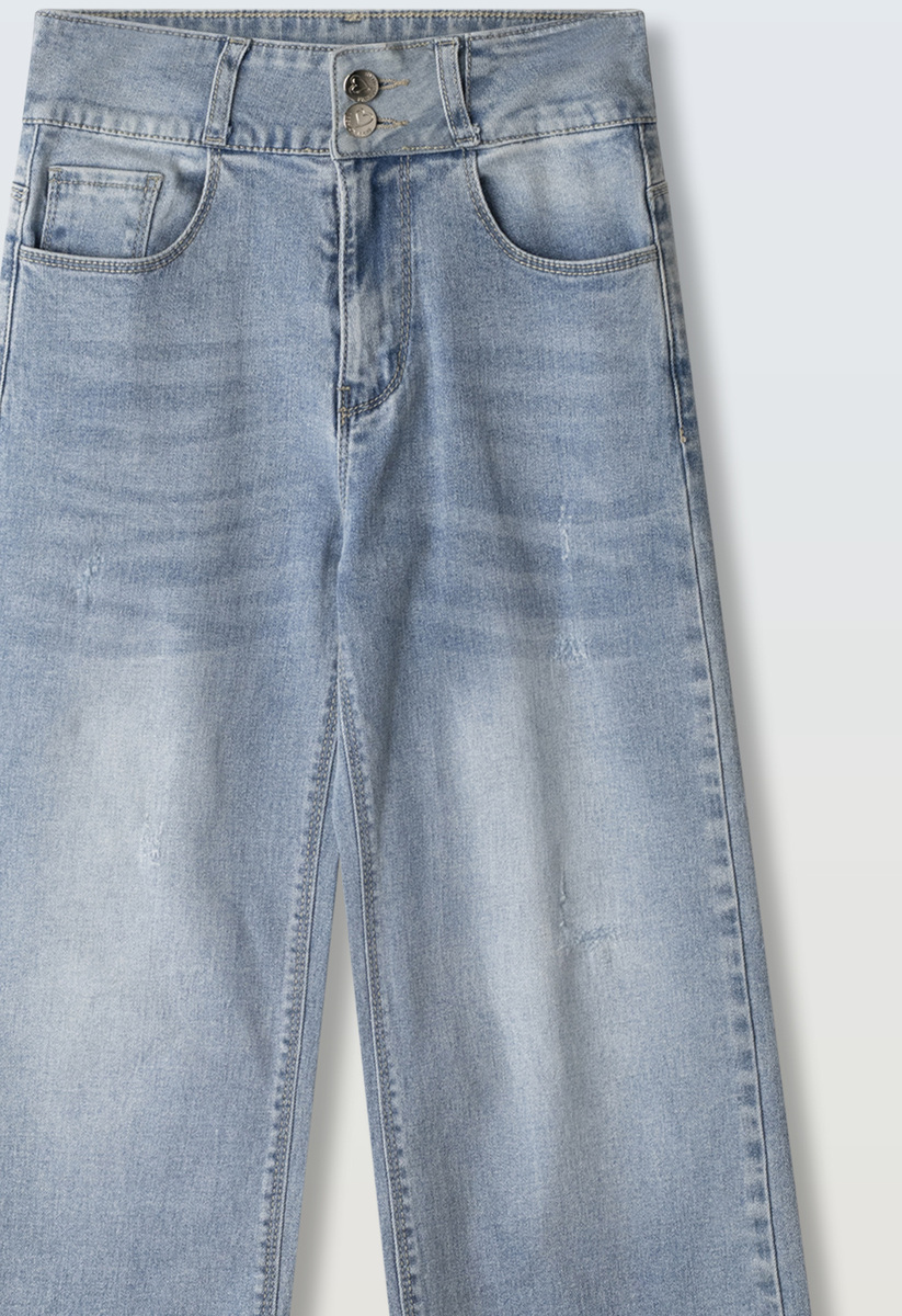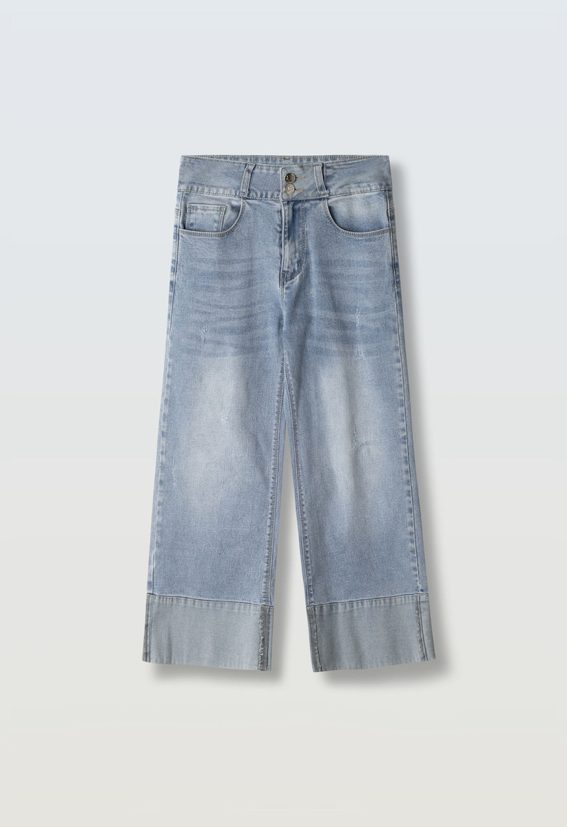 Τζιν παντελόνι ΕΒΙΤΑ σε χρώμα μπλε ανοιχτό πετροπλυμένο, κλείσιμο με φερμουάρ, γυρισμένα ρεβέρ και φαρδιά γραμμή.