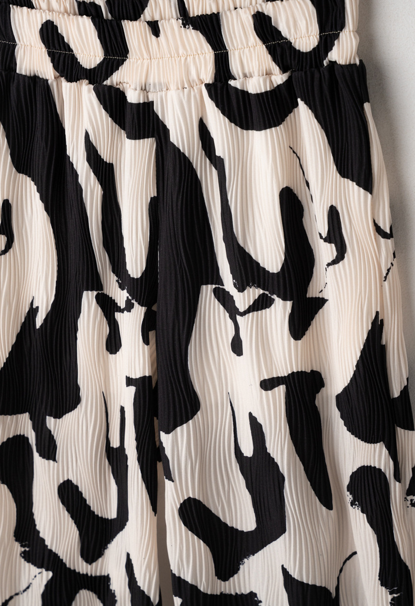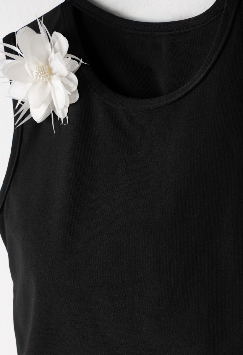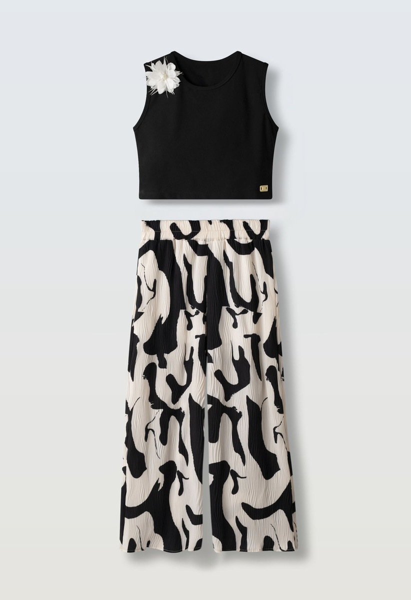 Σετ παντελόνα ΕΒΙΤΑ, μπλούζα αμάνικη σε χρώμα μαύρο με διακοσμητικό λουλούδι στον ώμο, κοψίματα στην πλάτη και παντελόνα εμπριμέ με λάστιχο στη μέση σε χρώμα εκρού με μαύρο.