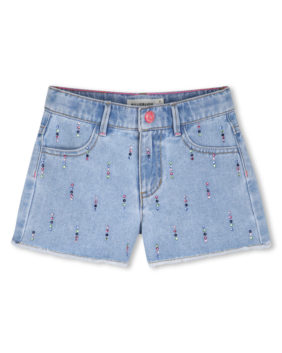 Σορτς τζιν BILLIEBLUSH με πολύχρωμα τρουκς στο μπροστινό μέρος, κούμπωμα με φερμουάρ και εσωτερικό ρυθμιζόμενο λάστιχο στη μέση. Διαθέτει δύο εσωτερικές τσέπες στο μπροστινό μέρος και δύο εξωτερικές στο πίσω