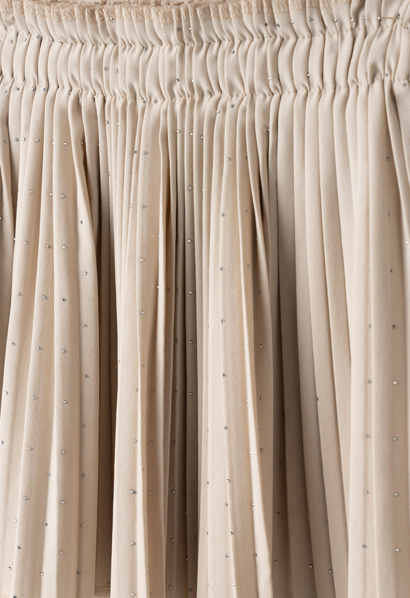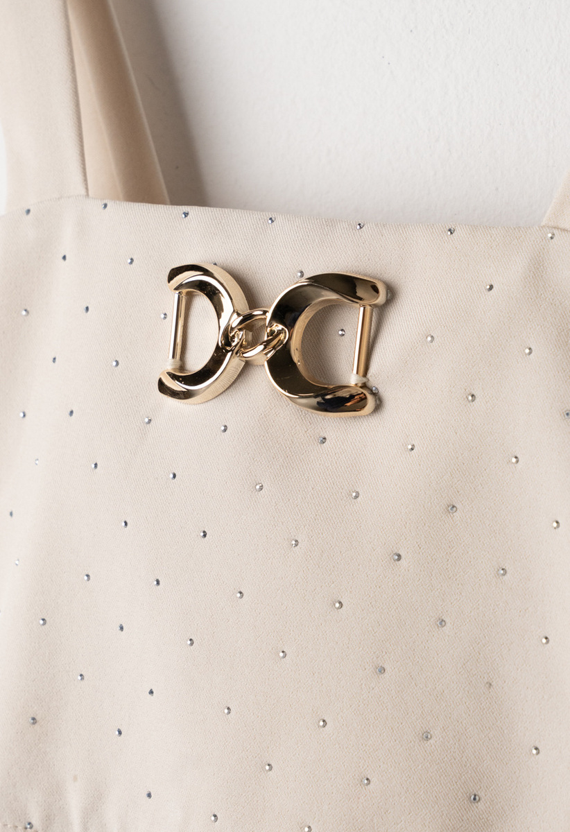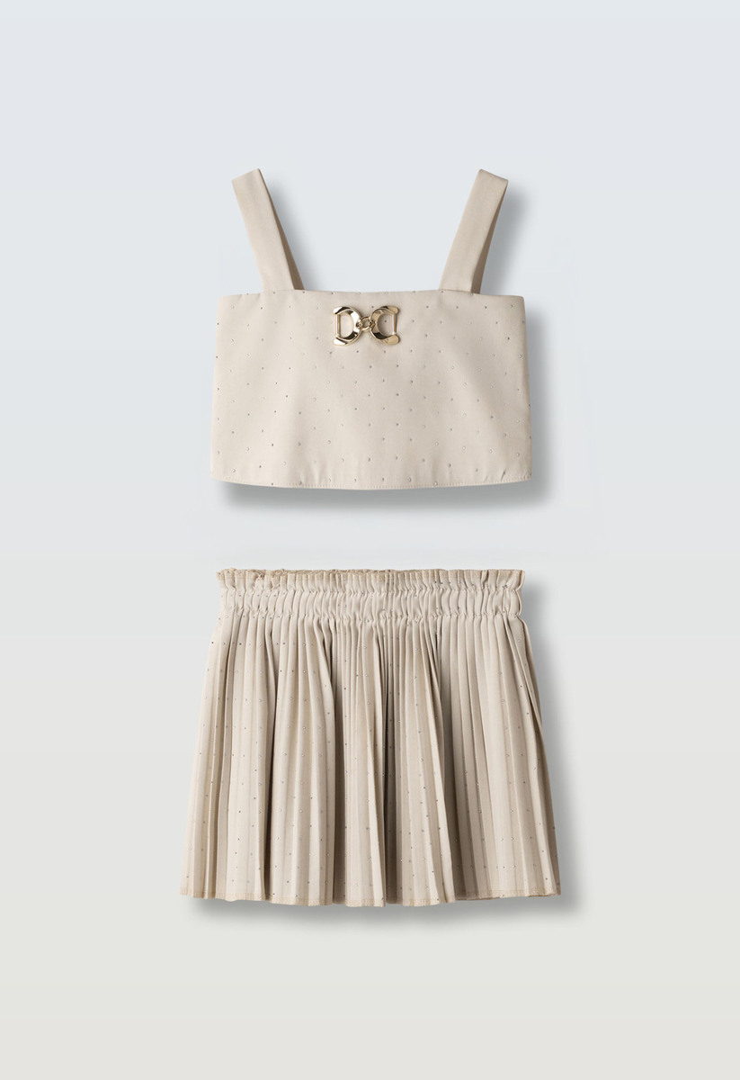 Σετ φούστα ΕΒΙΤΑ, μπλούζα κοντή με τιράντες, τρισδιάστατο χρυσό σχέδιο στο μπούστο και φούστα πλισέ με λάστιχο στη μέση σε χρώμα μπεζ, διαθέτει all over διακοσμητικό στρας.