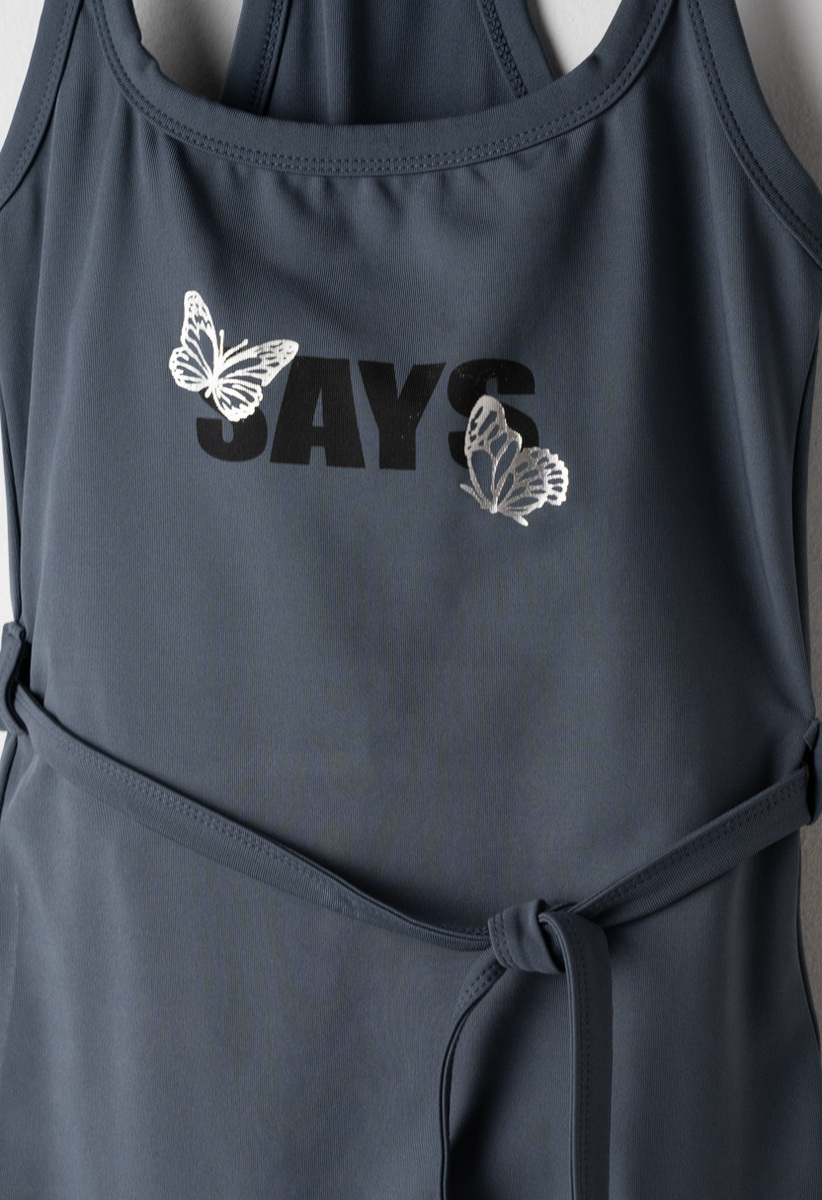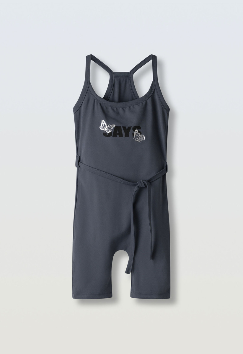 Ολόσωμο σορτς εφαρμοστό ΕΒΙΤΑ σε χρώμα ανθρακί με τιράντες, ιδιαίτερο σχέδιο στην πλάτη, μεταλλιζέ τύπωμα και ασορτί ανεξάρτητο ζωνάκι στη μέση.