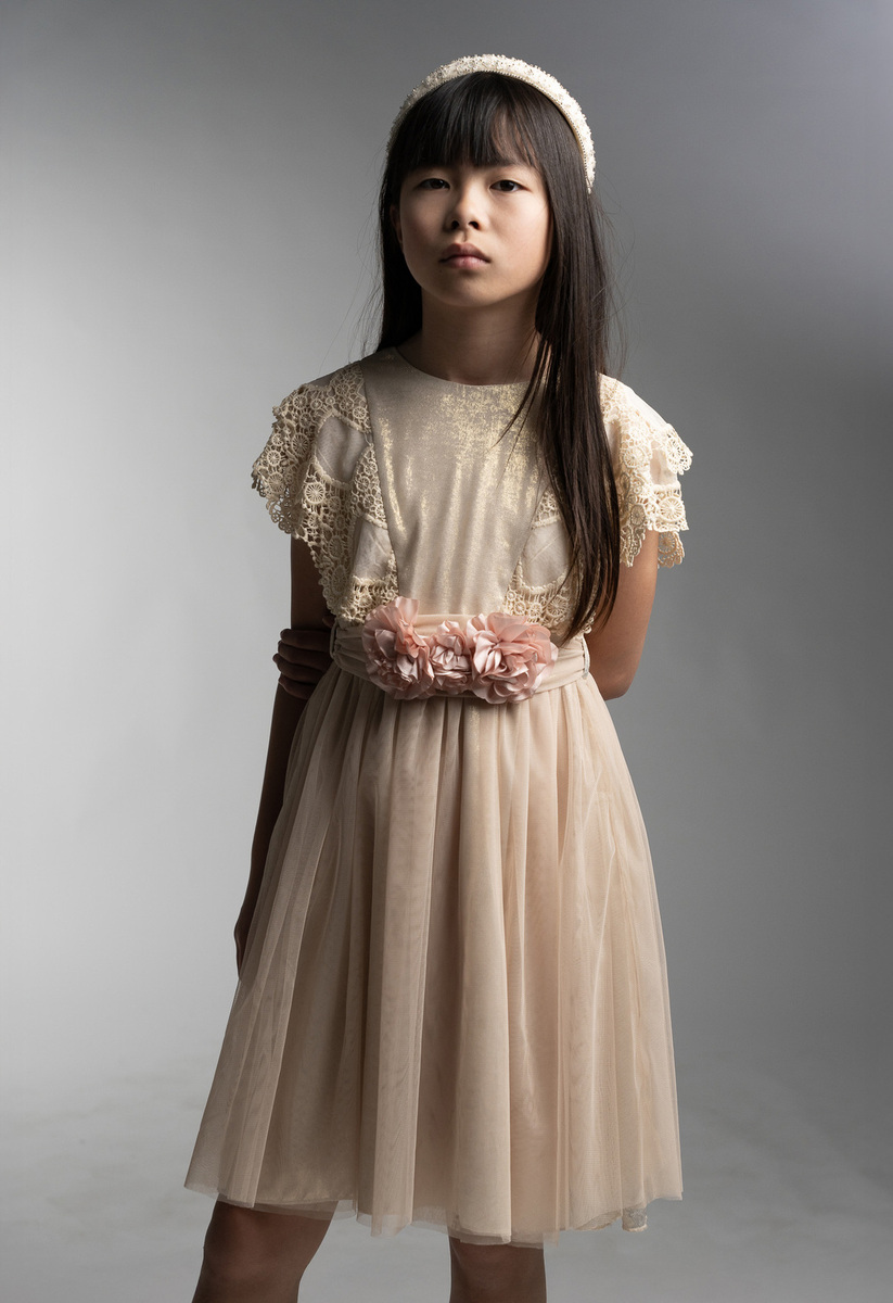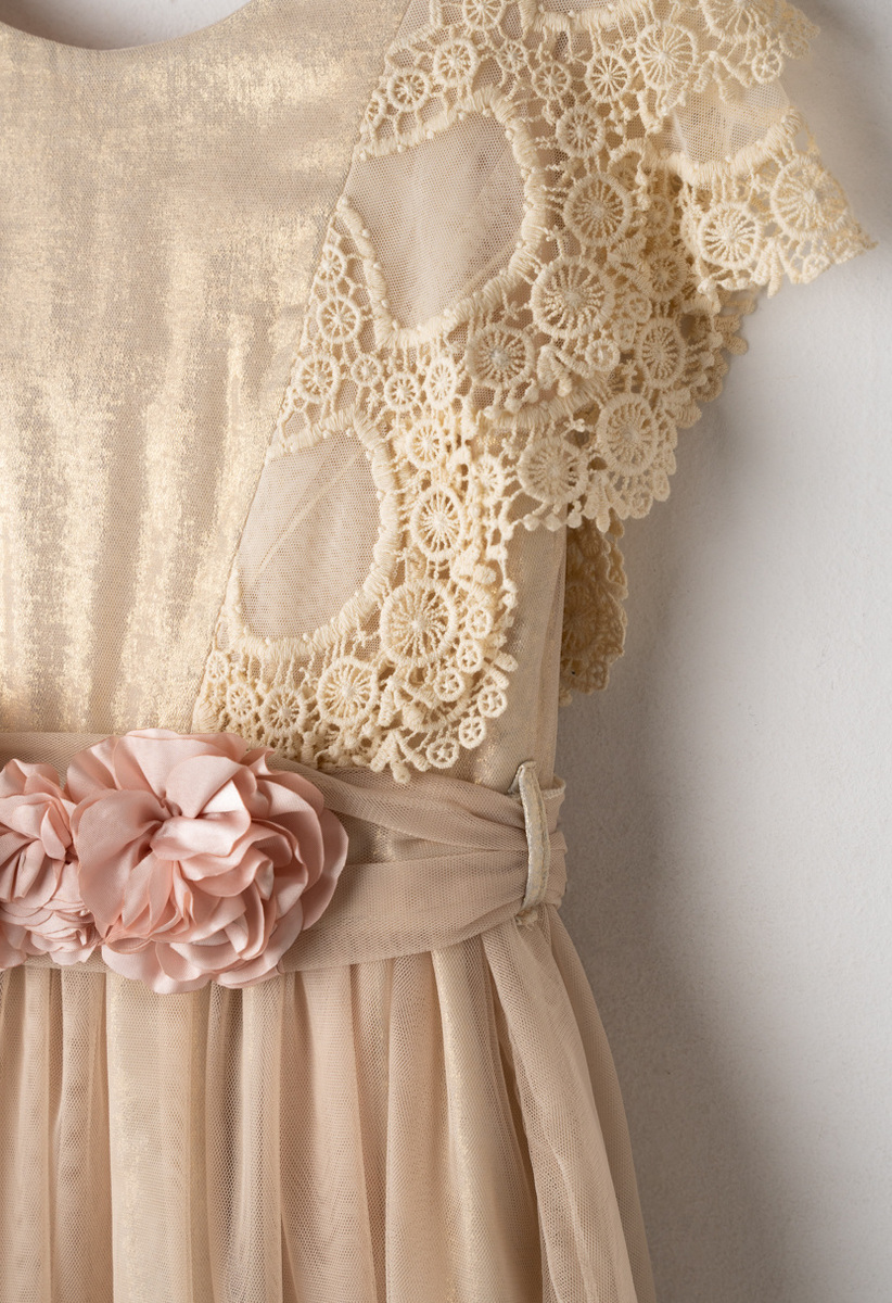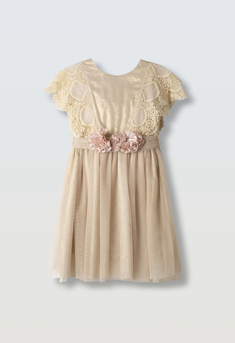 Φόρεμα ΕΒΙΤΑ σε χρώμα μπεζ, ιδιαίτερα μανίκια με διαφάνεια, διακοσμητικό κέντημα και τούλινο τελείωμα. Διαθέτει ασορτί αποσπώμενη ζώνη με τρισδιάστατο διακοσμητικό λουλούδι και κλείσιμο με φερμουάρ στο πίσω μέρος.