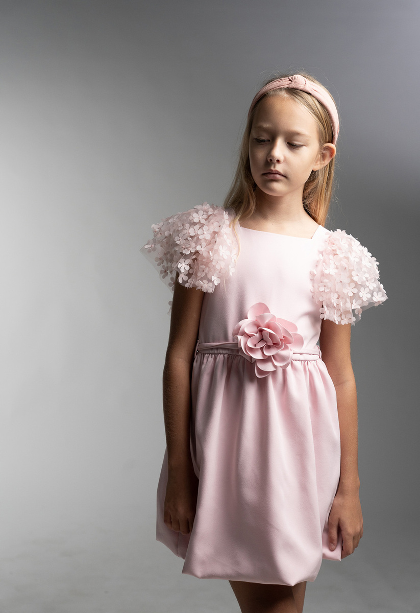 Φόρεμα ΕΒΙΤΑ σε ροζ χρώμα, ιδιαίτερα μανίκια από τούλι διακοσμημένα με τρισδιάστατα λουλούδια, αποσπώμενη ζώνη μέσης και κούμπωμα με φερμουάρ στο πίσω μέρος. Διαθέτει ασορτί στέκα μαλλιών.