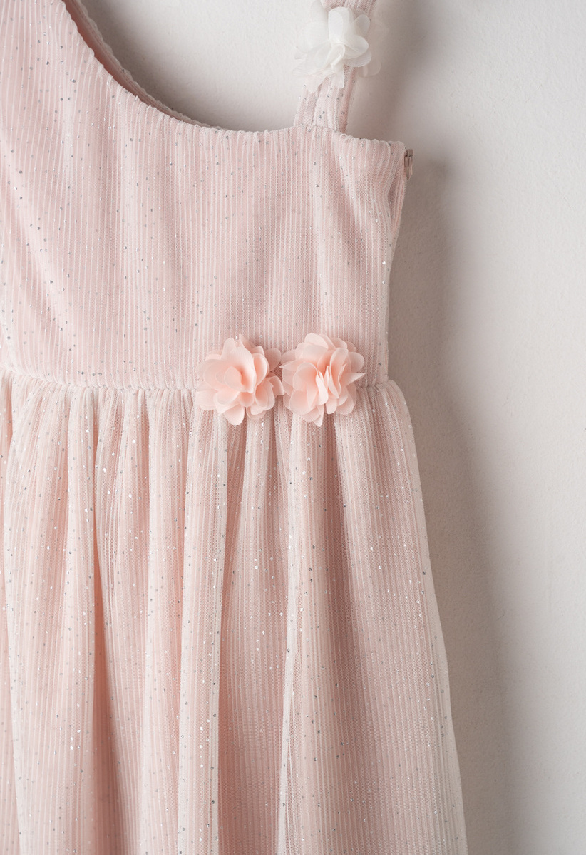 Φόρεμα ΕΒΙΤΑ από τούλι σε ροζ χρώμα, ιδιαίτερα διαφορετικά μανίκια, τρισδιάστατα διακοσμητικά λουλούδια στη μέση, κλείσιμο με φερμουάρ στο πλάι και εσωτερική επένδυση. Διαθέτει ασορτί τσαντάκι.