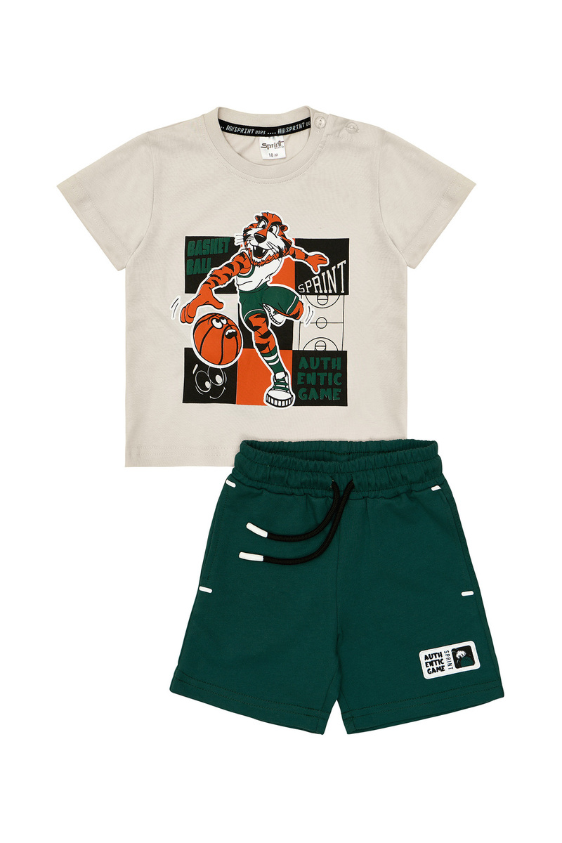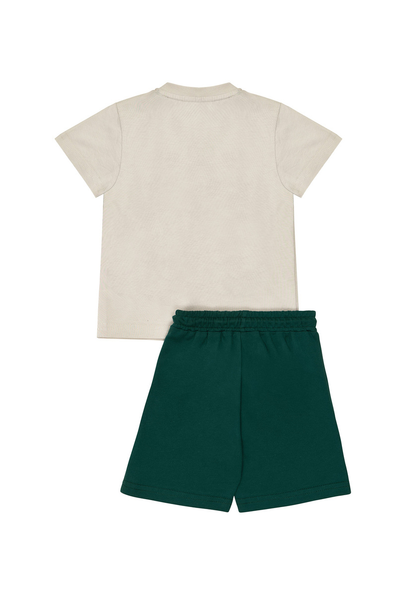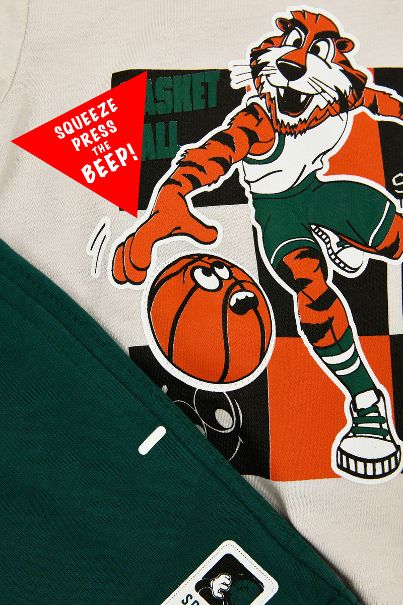 Βαμβακερό σετ SPRINT, μπλούζα σε χρώμα μπεζ με ανάγλυφο τύπωμα στο μπροστινό μέρος, εσωτερικό παιχνίδι που παράγει ήχο και βερμούδα με λάστιχο και ρυθμιζόμενο κορδόνι στη μέση σε χρώμα πράσινο. Διαθέτει δύο μπροστινές εσωτερικές τσέπες.