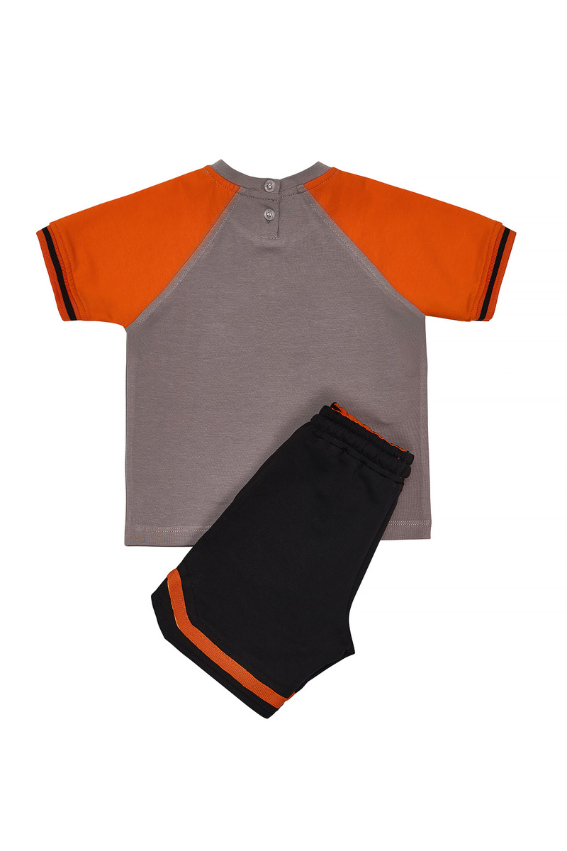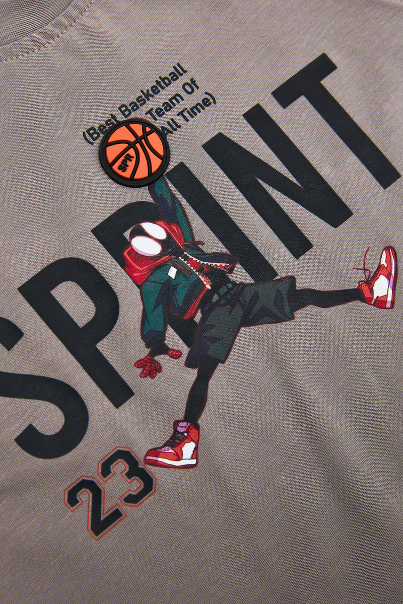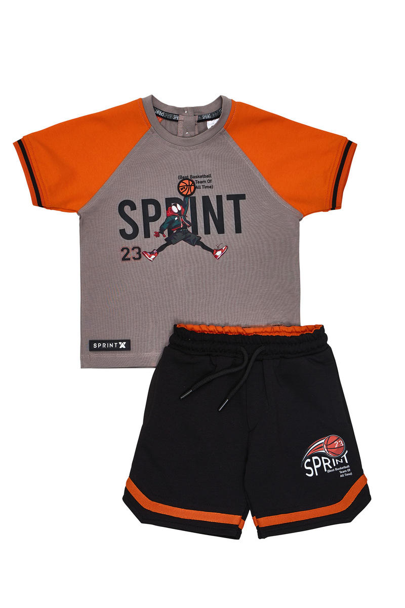 Βαμβακερό σετ SPRINT, μπλούζα σε γκρι χρώμα με ανάγλυφο τύπωμα στο μπροστινό μέρος και τρισδιάστατο σχέδιο μπάλα μπάσκετ. Βερμούδα σε χρώμα μαύρο με λάστιχο και ρυθμιζόμενο κορδόνι στη μέση. Διαθέτει δύο εσωτερικές τσέπες.