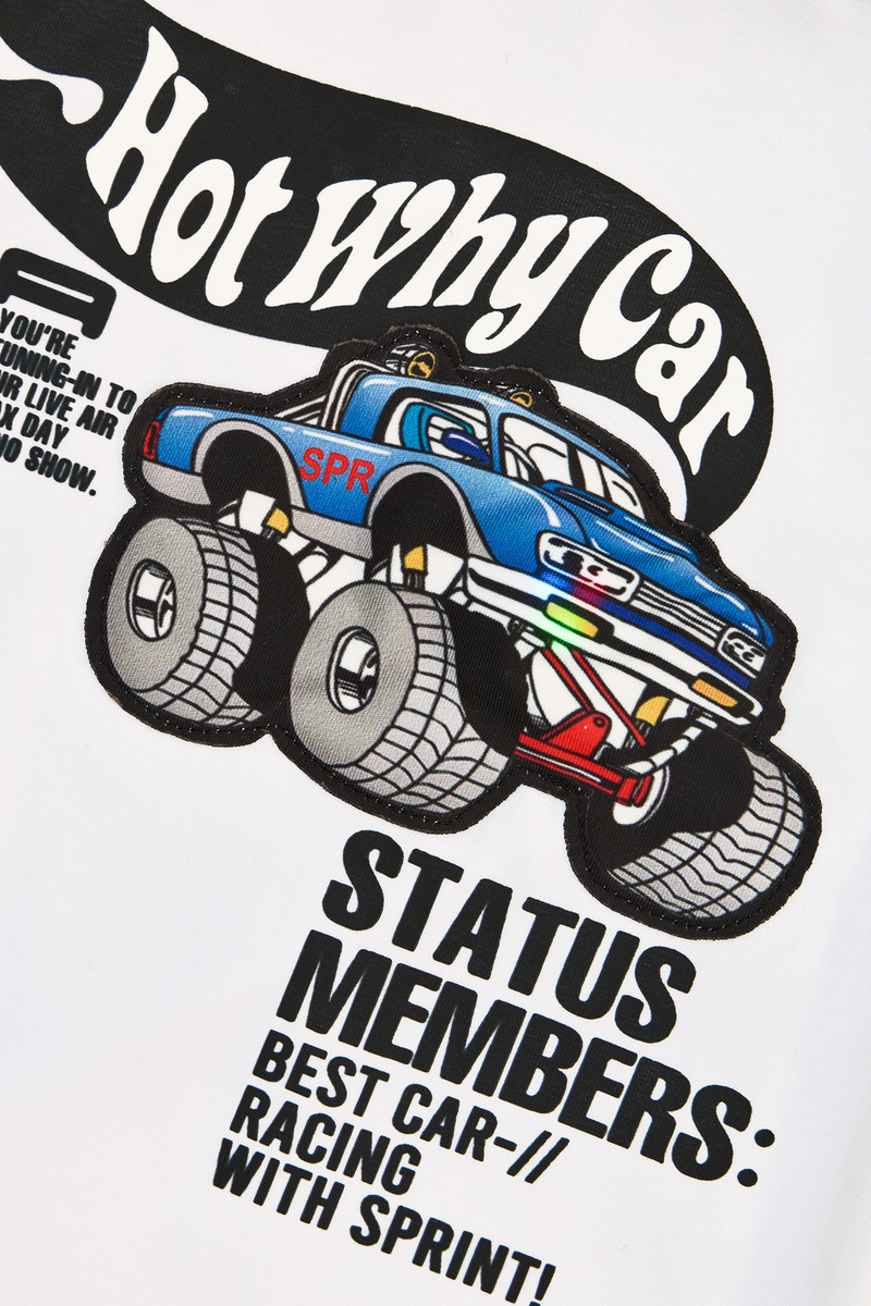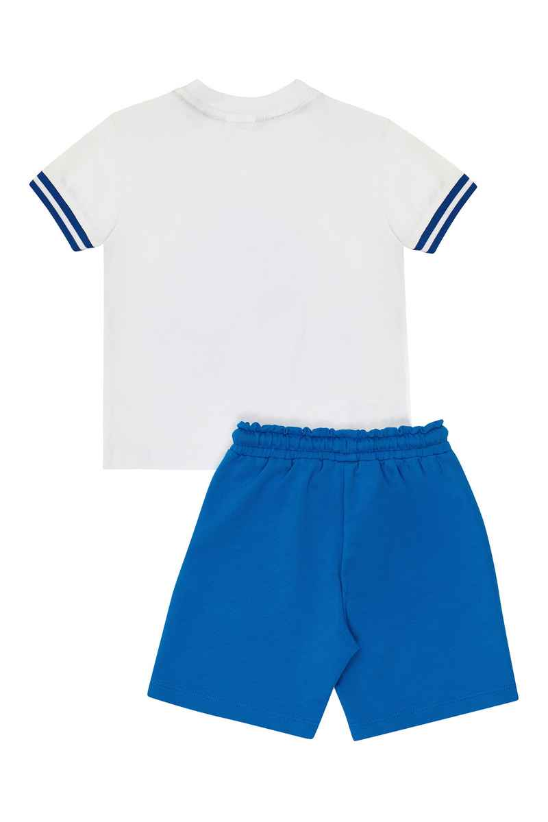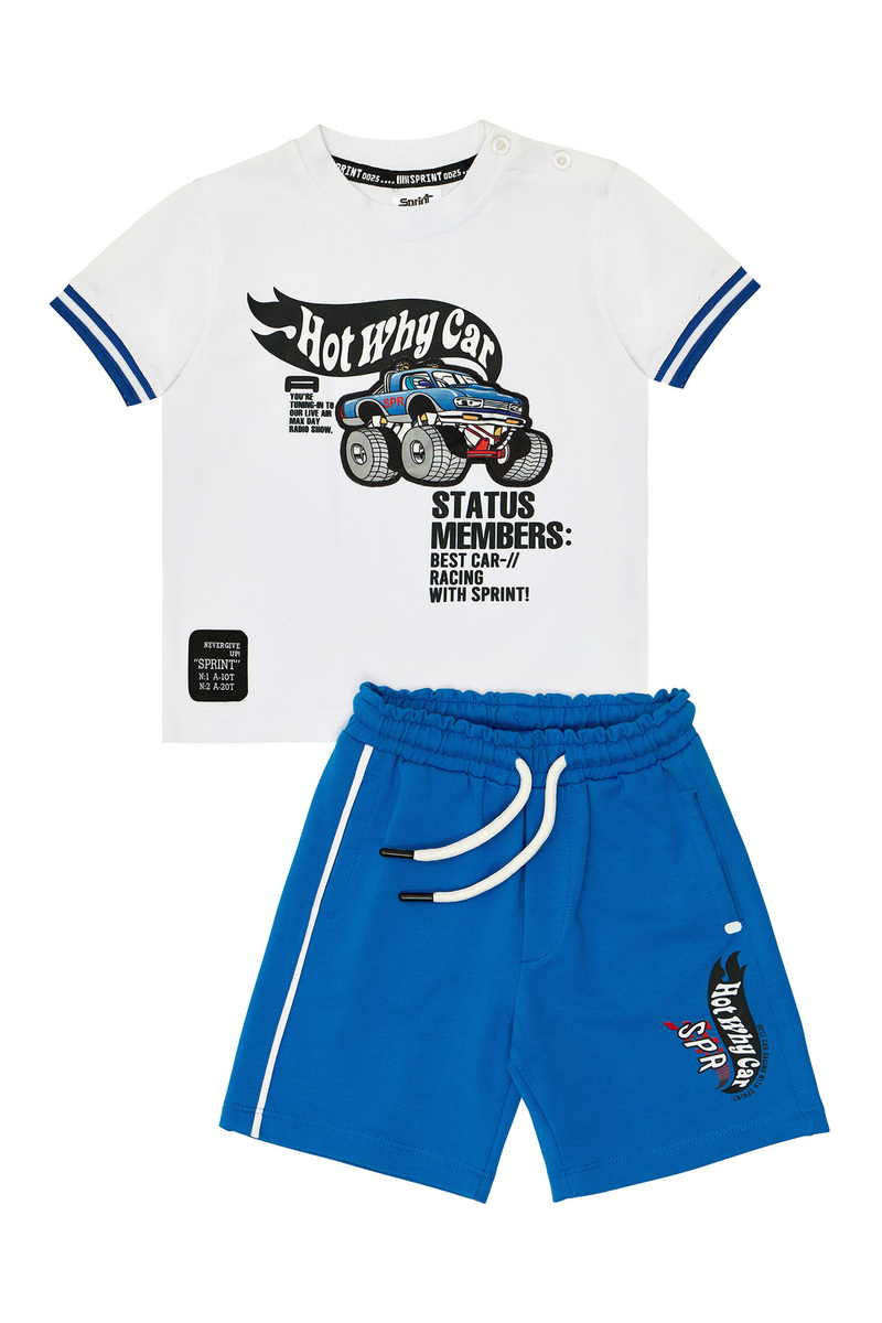 Βαμβακερό σετ SPRINT, μπλούζα σε χρώμα λευκό με ανάγλυφο τύπωμα στο μπροστινό μέρος και τρισδιάστατο σχέδιο, διαθέτει φωτάκι το οποίο ανάβει με την κίνηση. Βερμούδα σε χρώμα μπλε ρουά με λάστιχο, ρυθμιζόμενο κορδόνι στη μέση και δύο εσωτερικές τσέπες.