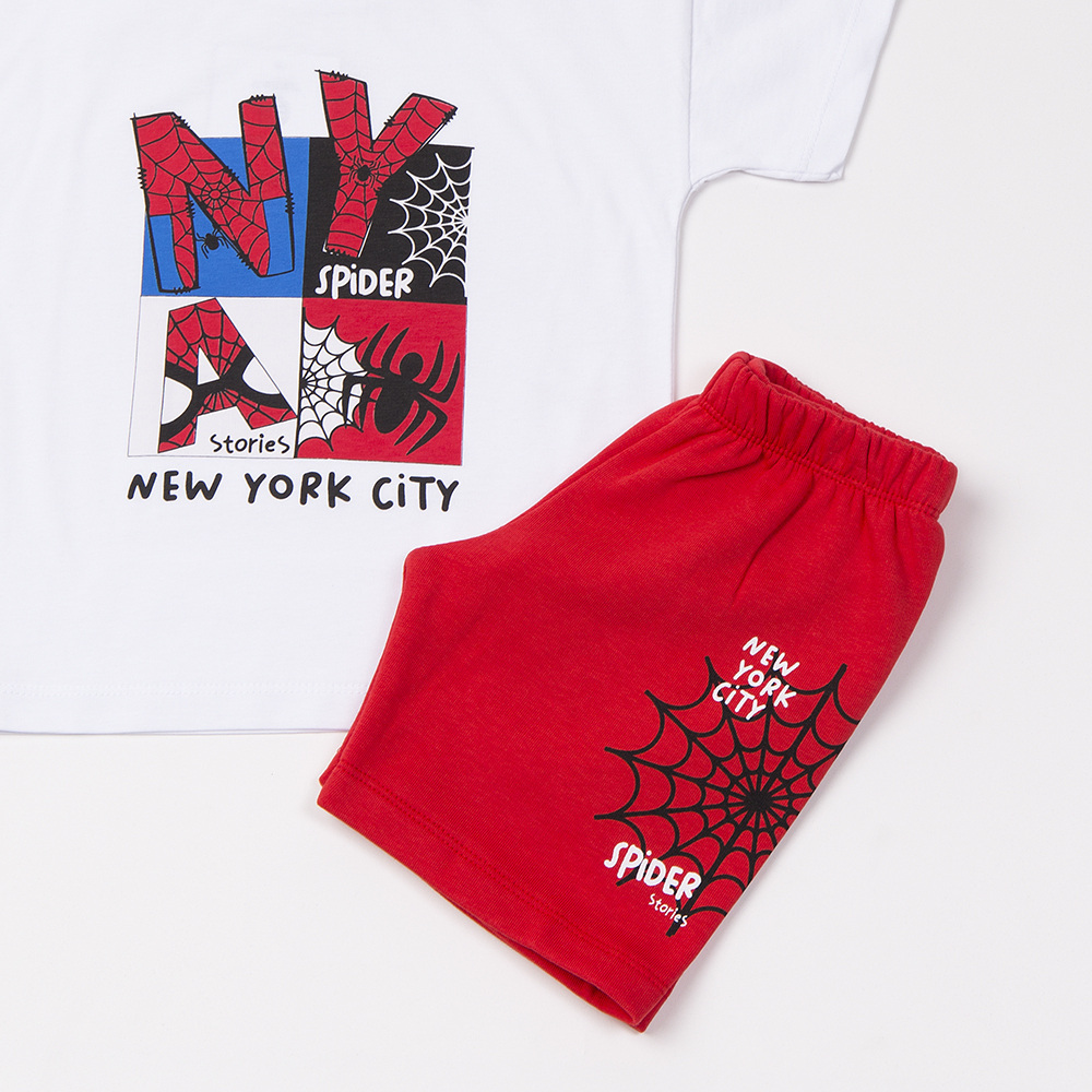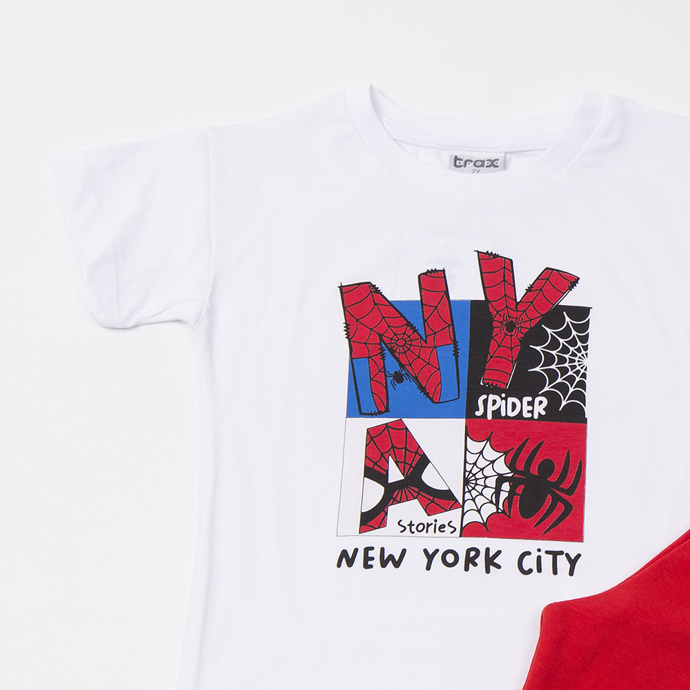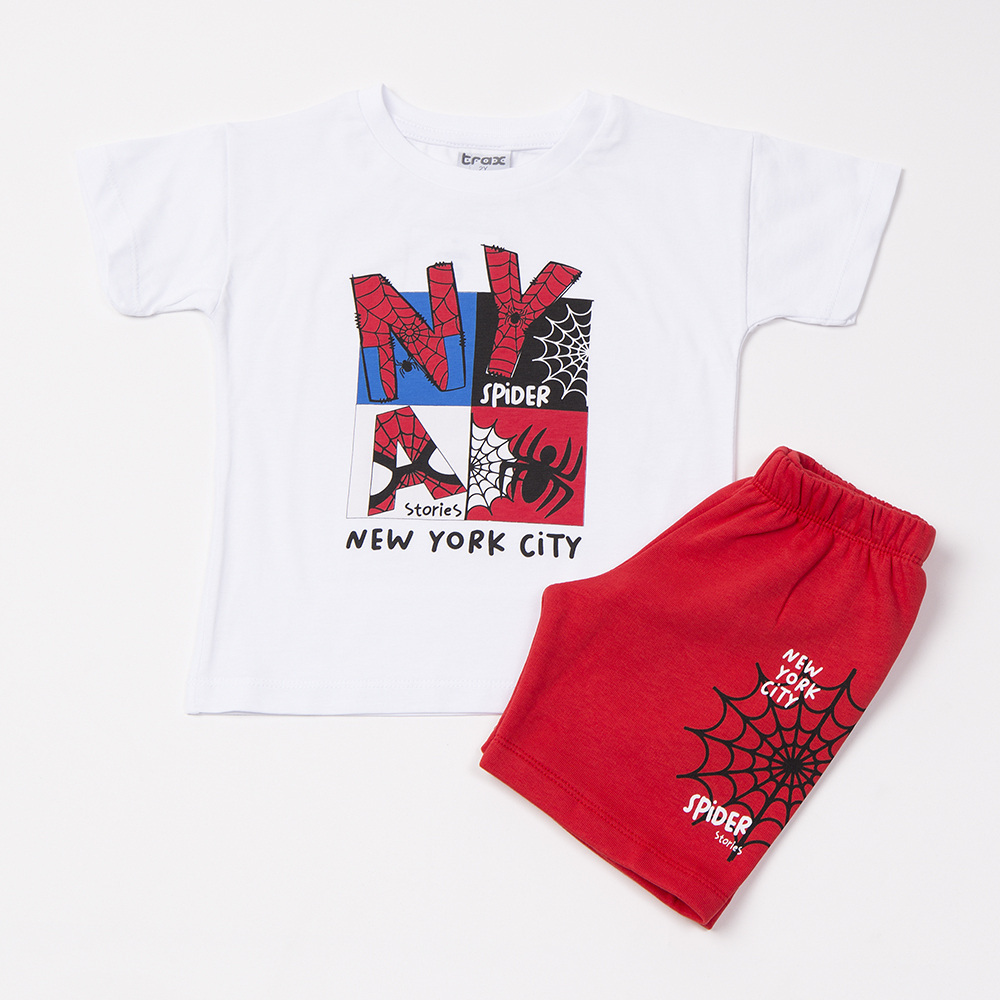 Βαμβακερό σετ TRAX, μπλούζα σε χρώμα λευκό με τύπωμα ήρωα στο μπροστινό μέρος και βερμούδα σε χρώμα κόκκινο με τύπωμα, διαθέτει λάστιχο στη μέση.