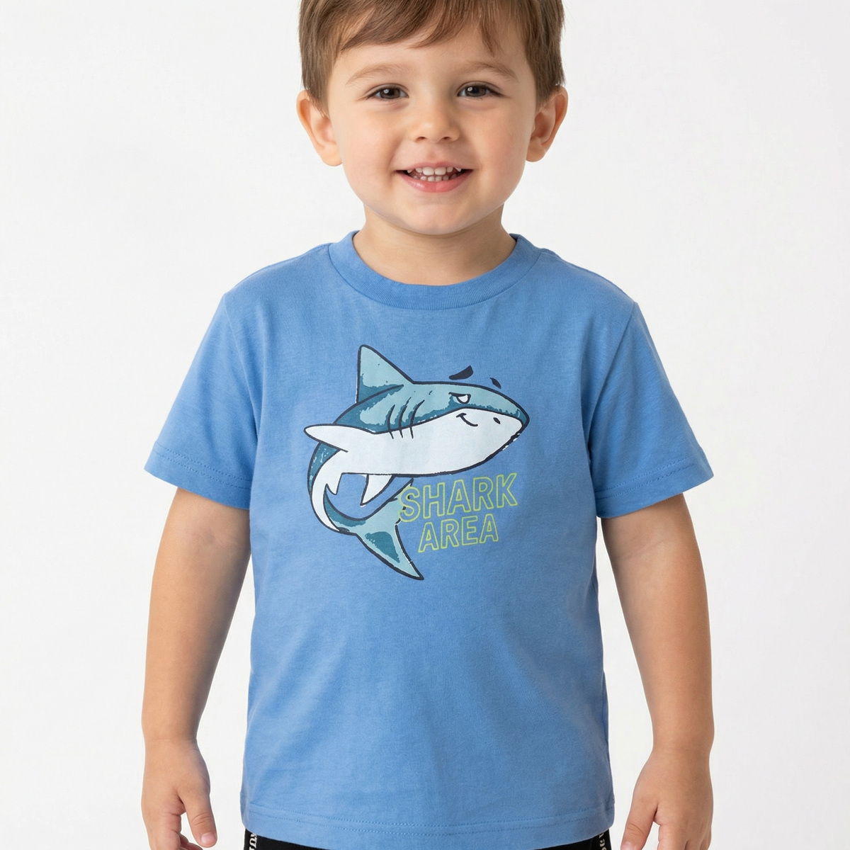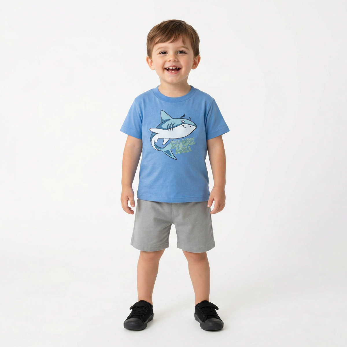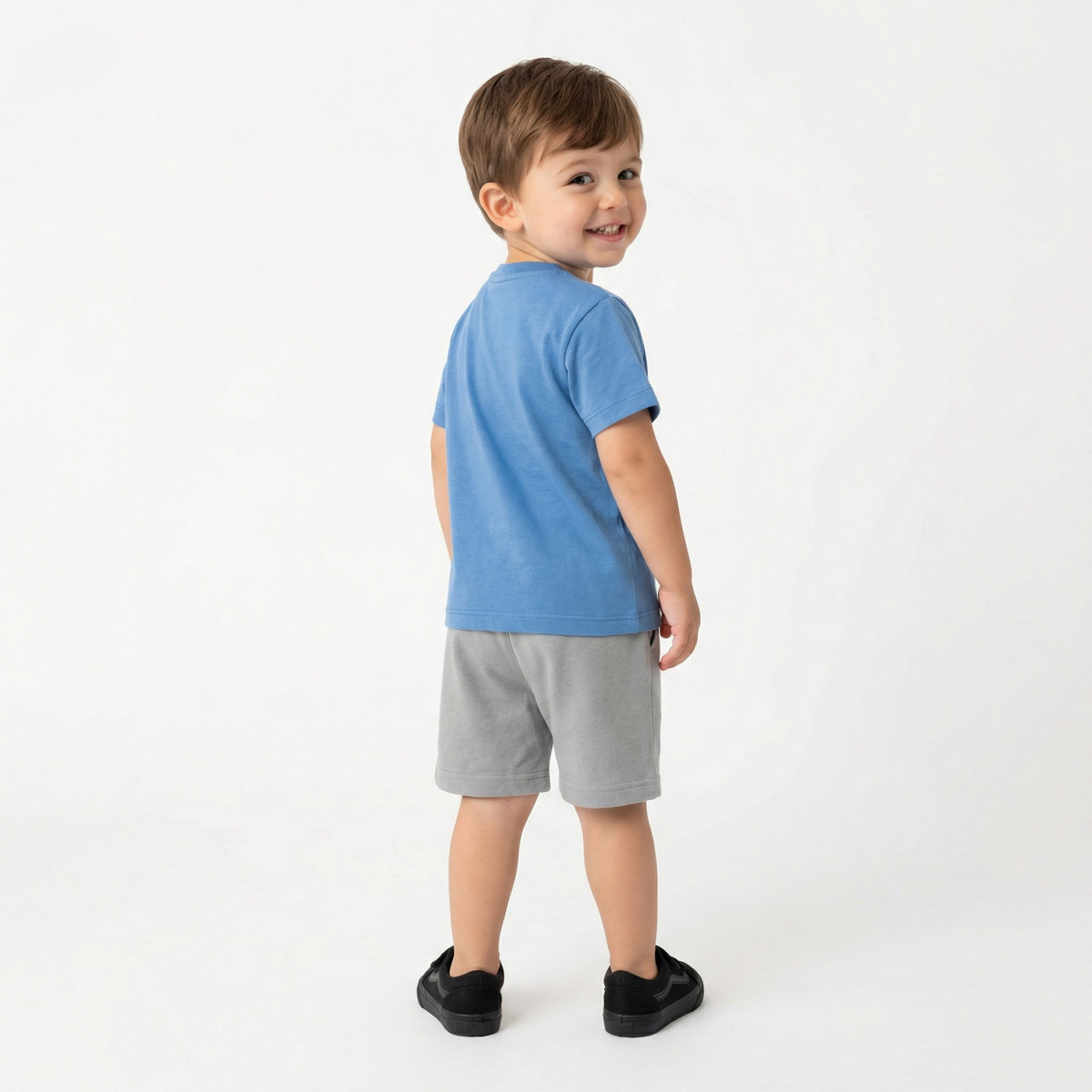 Βαμβακερό σετ TRAX, μπλούζα σε χρώμα σιέλ σκούρο με τύπωμα, στρογγυλή λαιμόκοψη και βερμούδα με λάστιχο στη μέση σε χρώμα γκρι.
