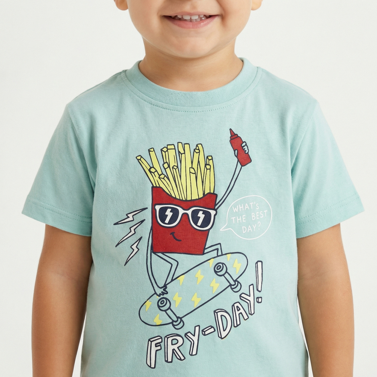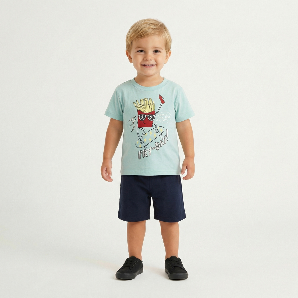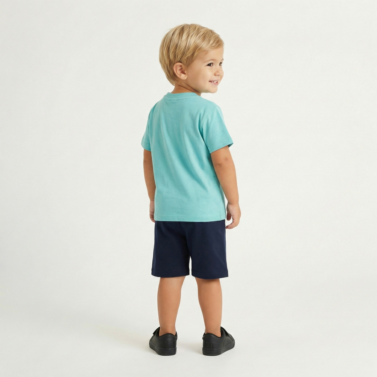 Βαμβακερό σετ TRAX, μπλούζα σε χρώμα τιρκουάζ με τύπωμα, στρογγυλή λαιμόκοψη και βερμούδα με λάστιχο στη μέση σε χρώμα μπλε.