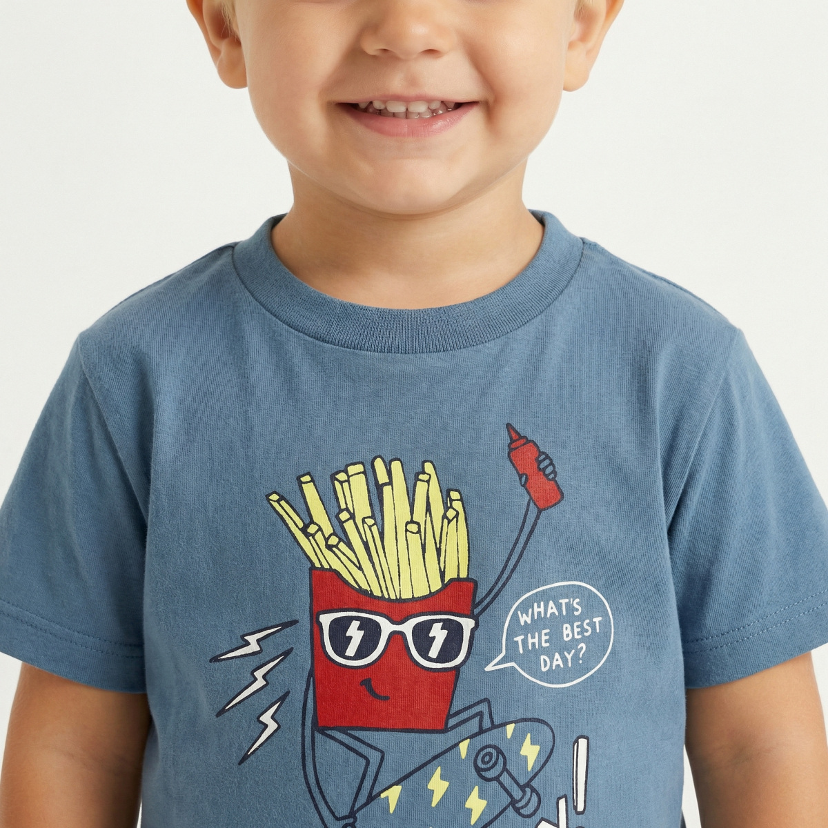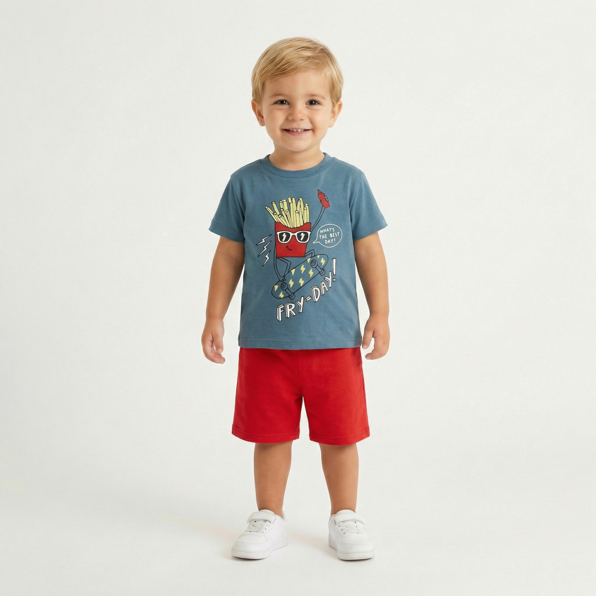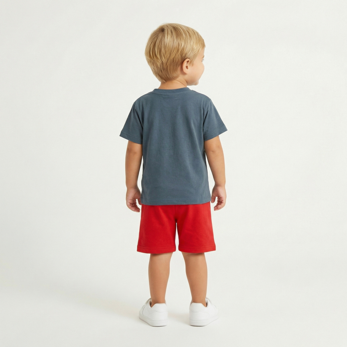 Βαμβακερό σετ TRAX, μπλούζα σε χρώμα μπλε ραφ με τύπωμα, στρογγυλή λαιμόκοψη και βερμούδα με λάστιχο στη μέση σε χρώμα κόκκινο.