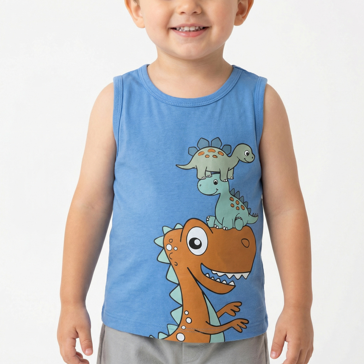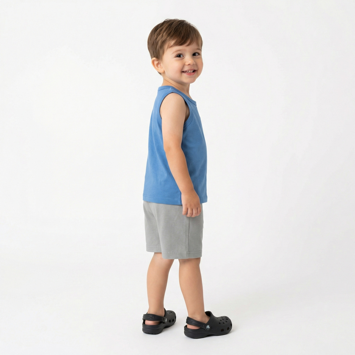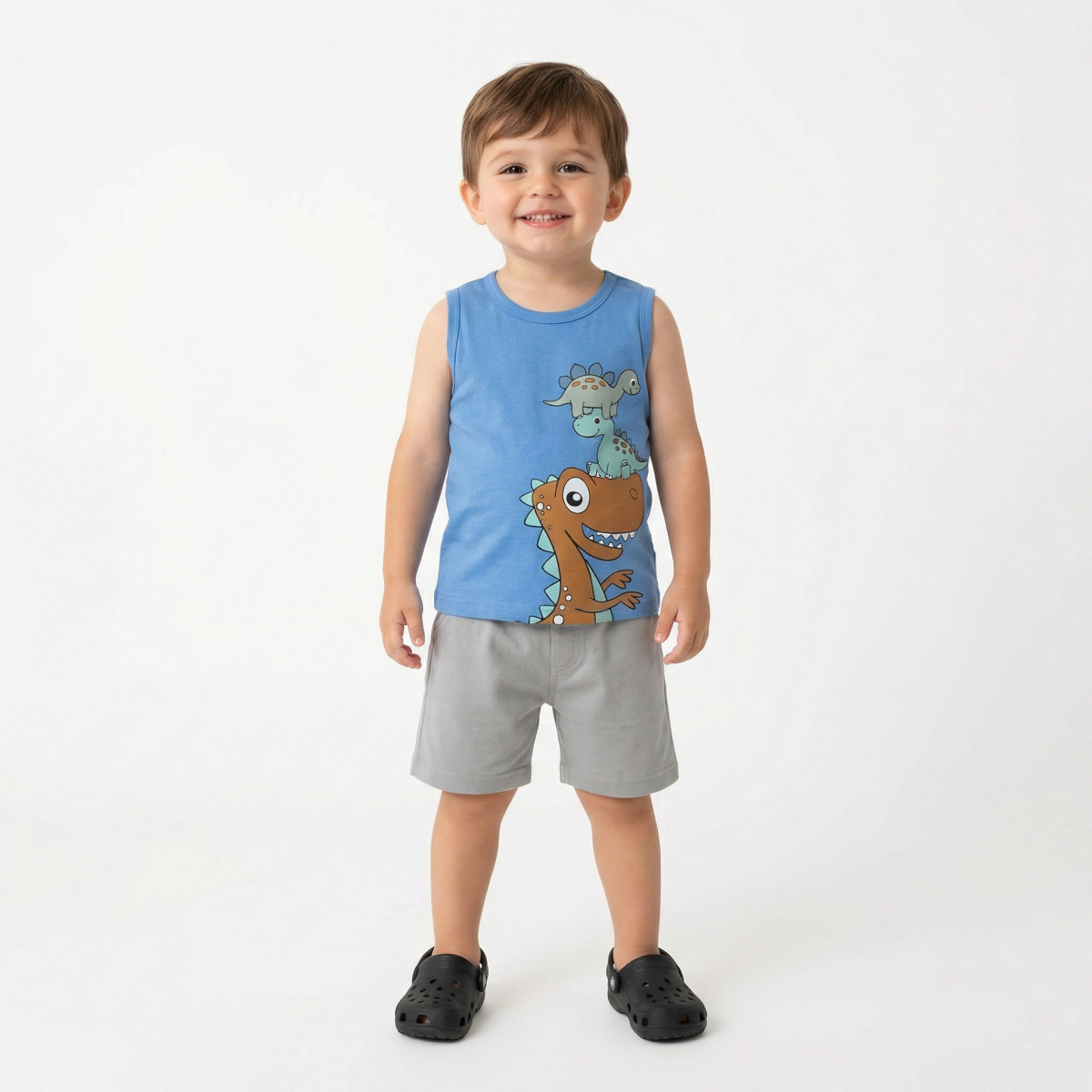 Βαμβακερό σετ TRAX, μπλούζα αμάνικη σε χρώμα σιέλ σκούρο με τύπωμα, στρογγυλή λαιμόκοψη και βερμούδα με λάστιχο στη μέση σε γκρι χρώμα.